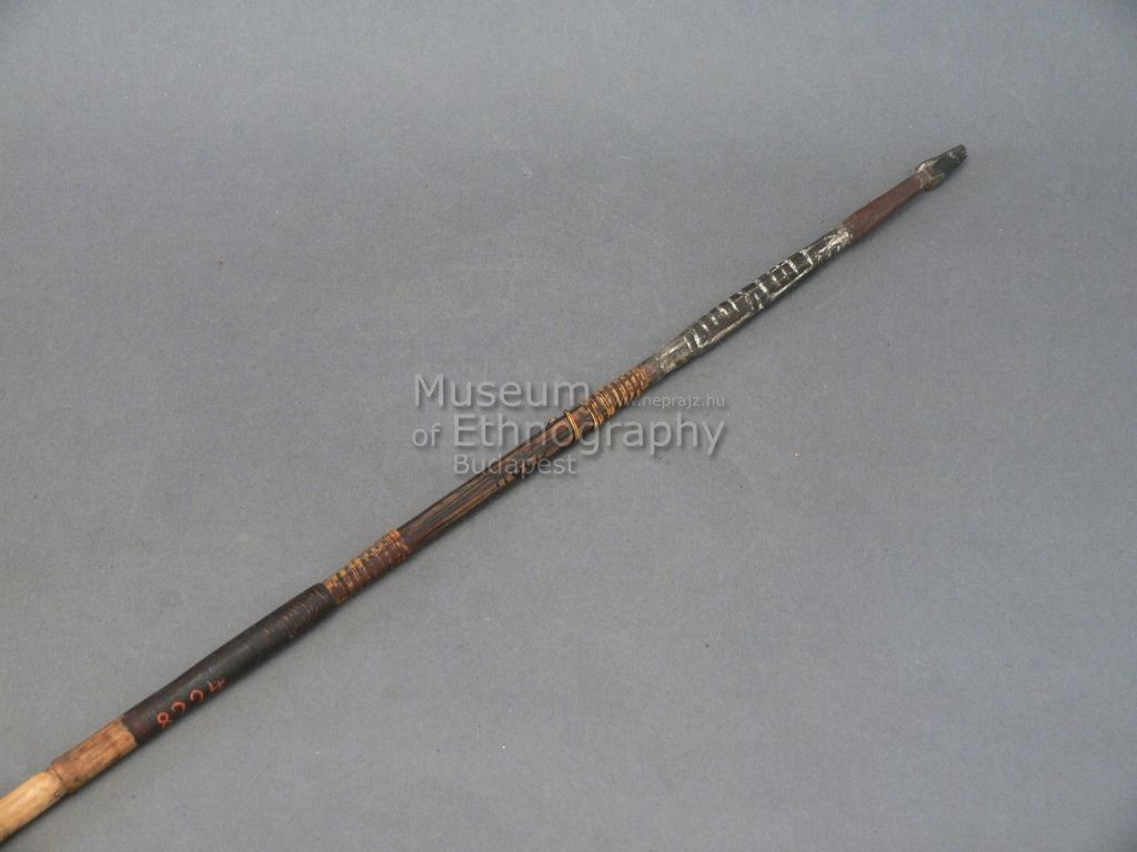 Kétrészes nyílvessző. A bambuszból készült szárba növényi rostfonttal rögzítették a fából faragott, kerek keresztmetszetű hegyet, melybe szakákat és geometrikus motívumokat faragtak. Ezeket fehér festéssel töltötték ki. A szárat beégetett motívumokkal díszítették.