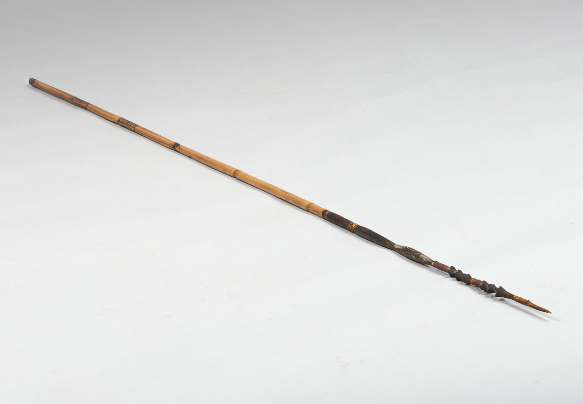 Kétrészes nyílvessző. A bambuszból készült szárba növényi rostfonttal rögzítették a fából faragott, kerek keresztmetszetű hegyet, melybe szakákat és geometrikus motívumokat faragtak. Ezeket fehér festéssel töltötték ki. A szárat beégetett motívumokkal díszítették.