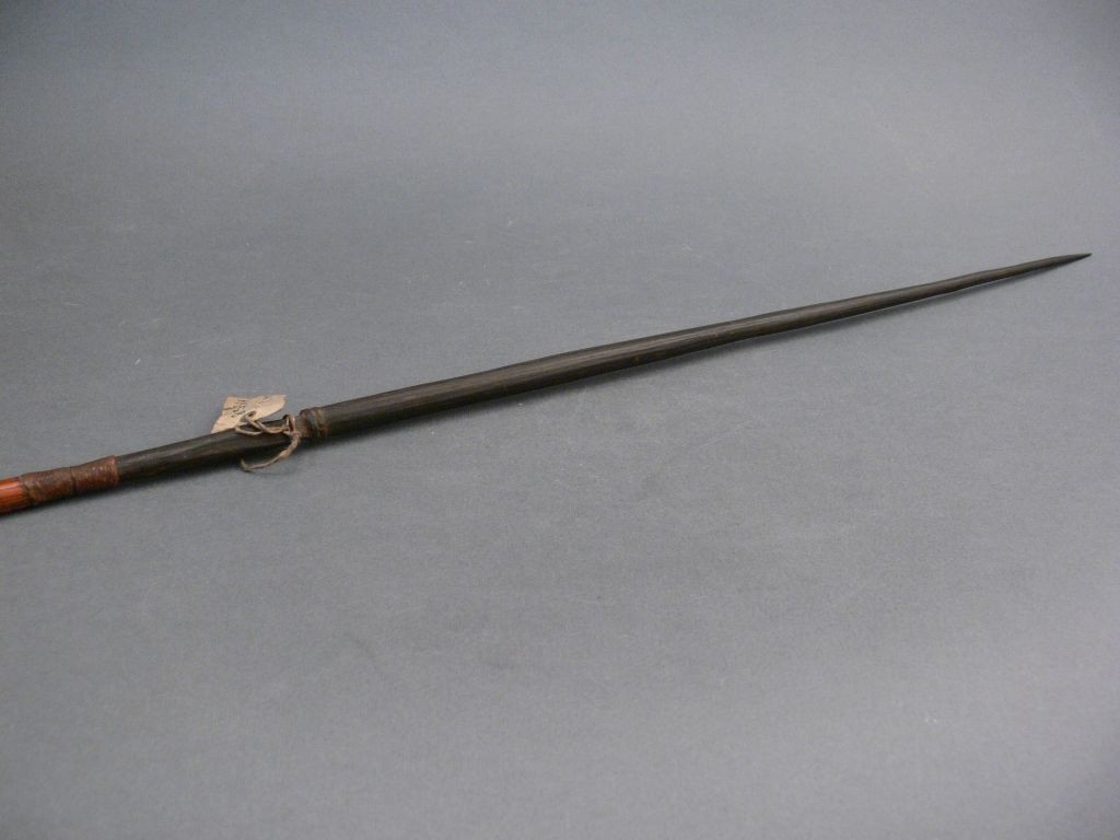 Kétrészes nyílvessző. A bambuszból metszett szárba növényi rostfonattal rögzítették a keményfából faragott kerek keresztmetszetű hegyet, melynek alsó harmadába körbefutó rovátkákat véstek. Szárába párhuzamosan futó hosszanti és rézsútos vonalakból álló mintázatot égettek.
