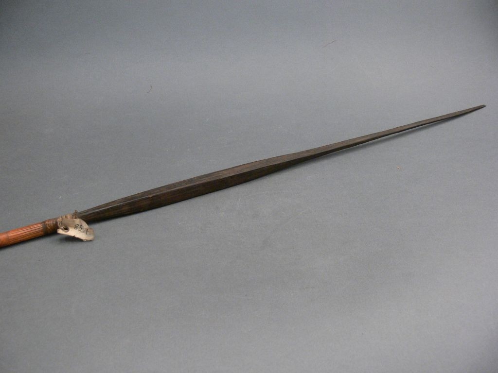 Kétrészes nyílvessző. A bambuszból metszett szárba növényi rostfonattal rögzítették a keményfából faragott, négyzetes keresztmetszetű hegyet. A szárat égetéssel készített geometrikus mintákkal díszítették.