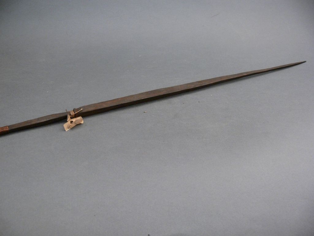 Kétrészes nyílvessző. A bambuszból metszett szárba növényi rostfonattal rögzítették a keményfából faragott négyzetes keresztmetszetű hegyet, melynek alsó harmadába körbefutó rovátkát véstek. Szárába hosszanti vonalakból és háromszögekből álló mintázatot égettek.