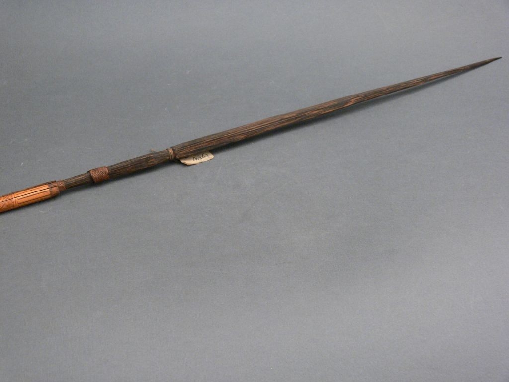Kétrészes nyílvessző. A bambuszból metszett szárba növényi rostfonattal rögzítették a keményfából faragott négyzetes keresztmetszetű hegyet, melynek alsó harmadába körbefutó rovátkát véstek. Szárába hosszanti vonalakból és háromszögekből álló mintázatot égettek.