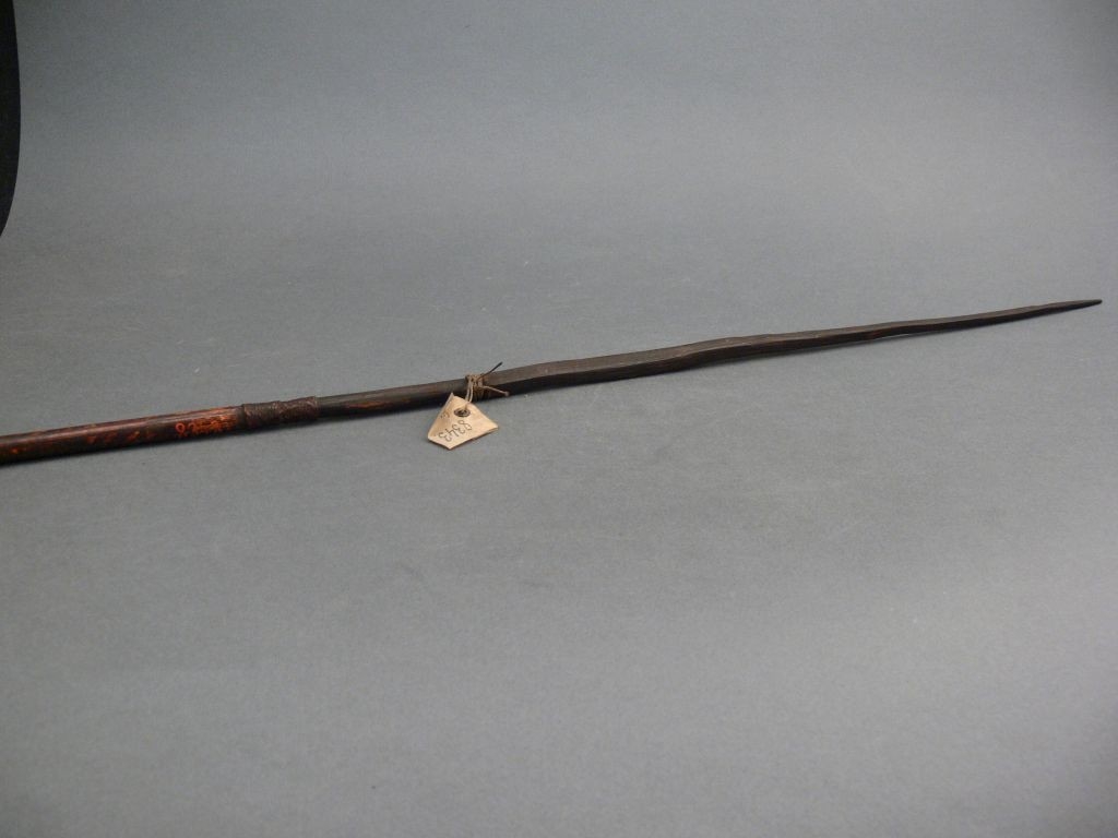 Kétrészes nyílvessző. A bambuszból metszett szárba növényi rostfonattal rögzítették a keményfából faragott négyzetes keresztmetszetű hegyet, melynek alsó harmadába körbefutó rovátkát véstek. Szárába hosszanti vonalakból és geometrikus elemekből álló mintázatot égettek.