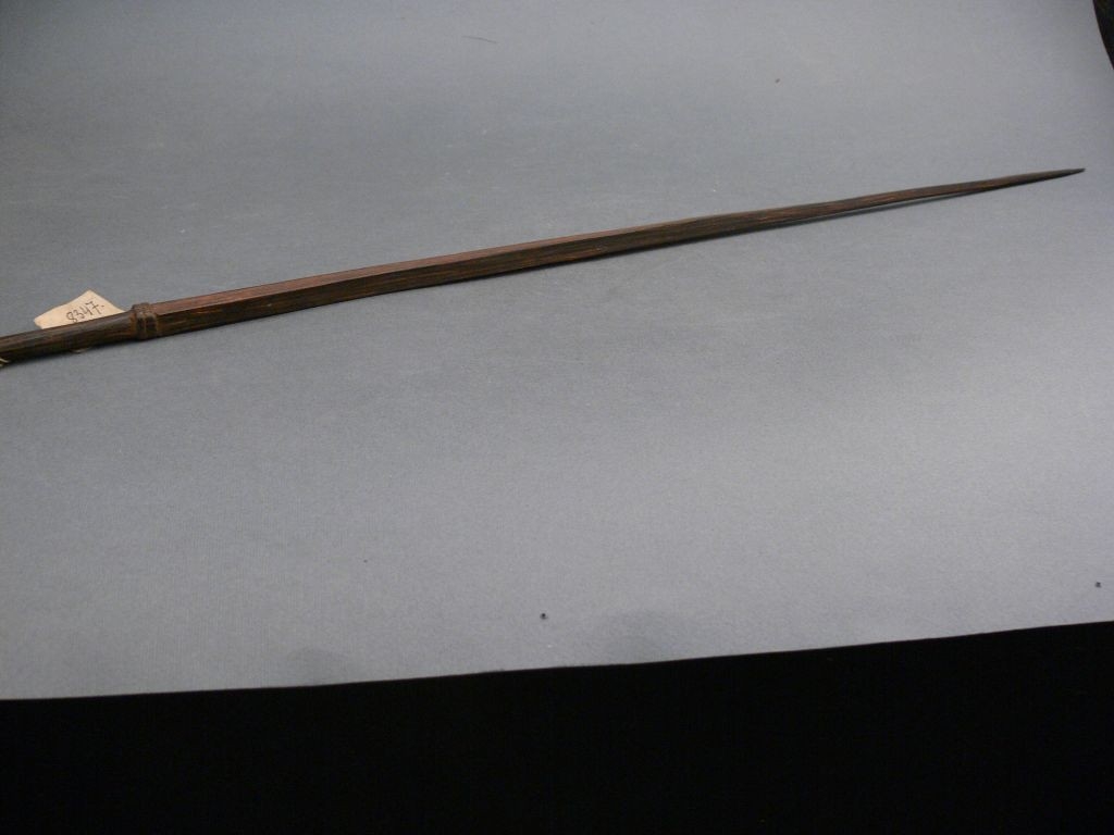 Kétrészes nyílvessző. A bambuszból metszett szárba növényi rostfonattal rögzítették a keményfából faragott négyzetes keresztmetszetű hegyet, melynek alsó harmadába körbefutó rovátkát véstek. Szárába hosszanti vonalakból és háromszögekből álló mintázatot égettek.