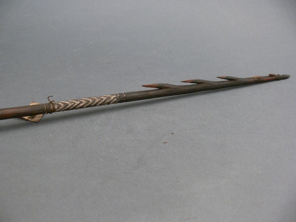 Kétrészes nyílvessző. A bambuszból metszett szárba növényi rostfonattal és ragasztóval rögzítették a keményfából faragott hegyet, melynek egyik oldalából szakák állnak ki, illetve amelybe fehér festékkel kitöltött, halszálka formájú rovátkákat faragtak.