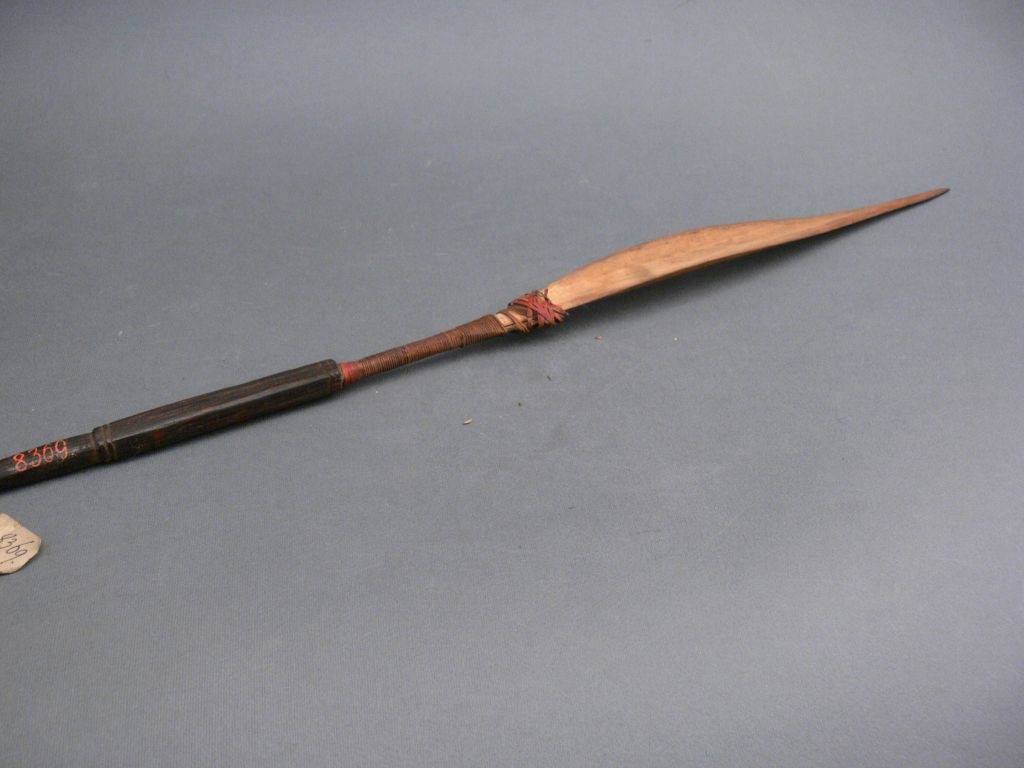 Kétrészes nyílvessző. A bambuszból metszett szárba növényi rostfonattal és ragasztóval rögzítették a keményfából faragott, sűrű rovátkákkal ellátott hegyet.
