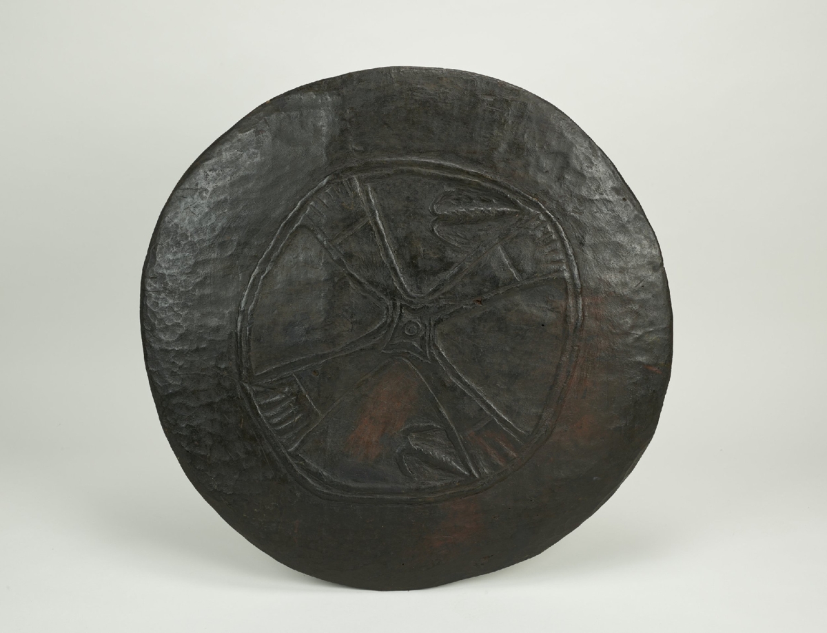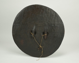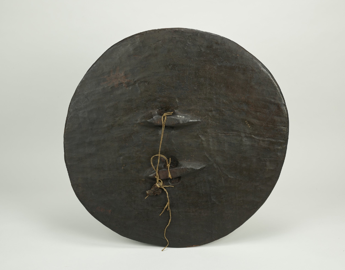 Nehéz faanyagból faragott, feketés színű, kerek tárgy. Hátsó oldalán két nyílás van, az ezen keresztül húzott tapacsikkal erősítik fel a karra a pajzsot. Külső oldalán kör alakú peremmel bezárt felületen átlós alakú díszítés, a peremhez kapcsolódó részen ujjakkal.