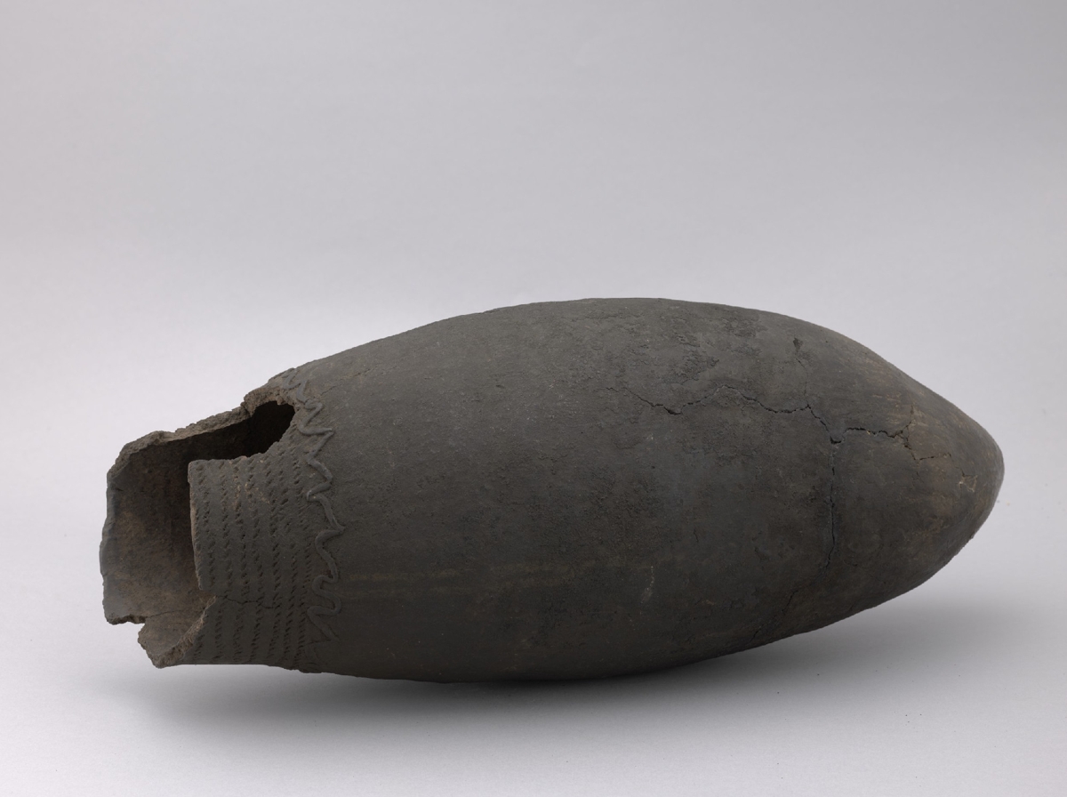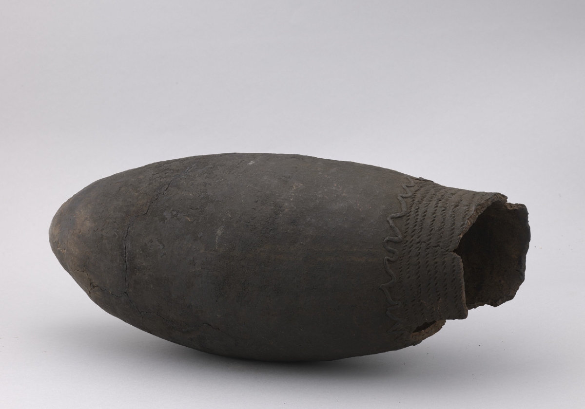 Durvaszemcsés sötét színűre égetett agyagból készült edény. Felülete kívül, belül simított. Spirális technikával készült. Csúcsos fenekű, erősen megnyúlt, hosszúkás ovid forma. Szájpereme amennyiben a töredékből megállapítható, egyenesen lemetszett volt. Az edény nyakrészét körbefutó plasztikus szabálytalan hullámvonalban futó díszítés választja el a testtől. A nyakrészt sűrű, párhuzamosan körbefutó állzsineg díszítés borítja.