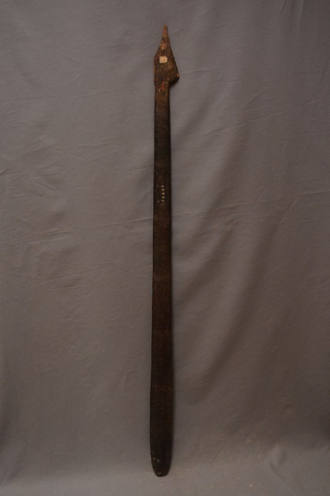 Sötétbarna pálmafából készült, ívelt profilú. Első vége egy 120 mm hosszú, díszítetlen tompa csúcsú háromszög. Az egyik szára mentén törött, a penge felül szabálytalan vonalú és keresztmetszetű. A vége lekerekített.