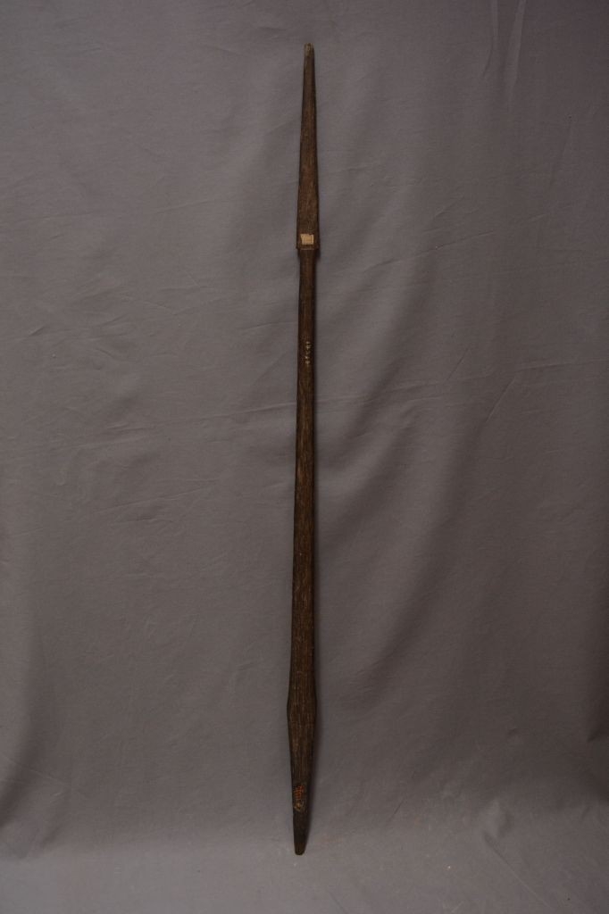 Sötétbarna keményfából készült, egyenes, plan-konvex keresztmetszetű. A markolat keresztmetszetre elkeskenyedő és elvékonyodó. A lekerekített végű hegy keresztmetszete 16,2 × 9,3 mm. PA