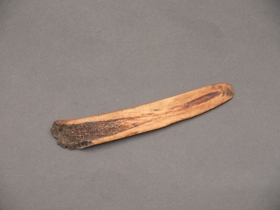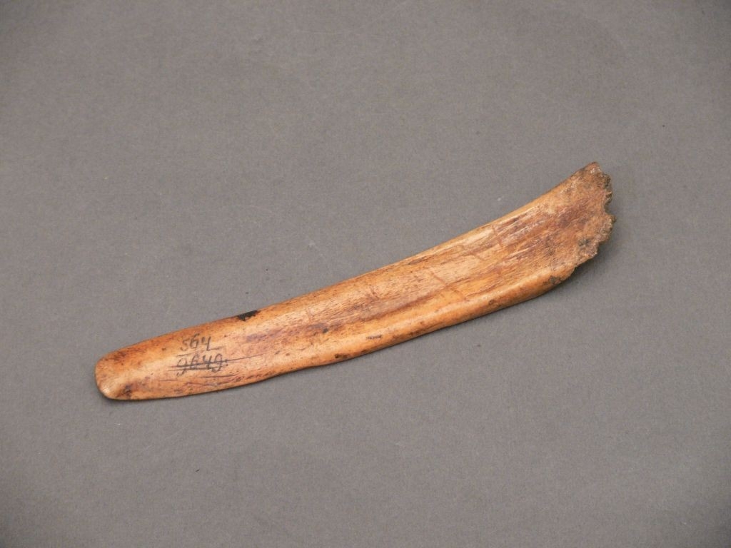 Sárgás-barnás színű, kés alakú, egyik oldalán sima, másikon recés, enyhén íves törött csontdarab.