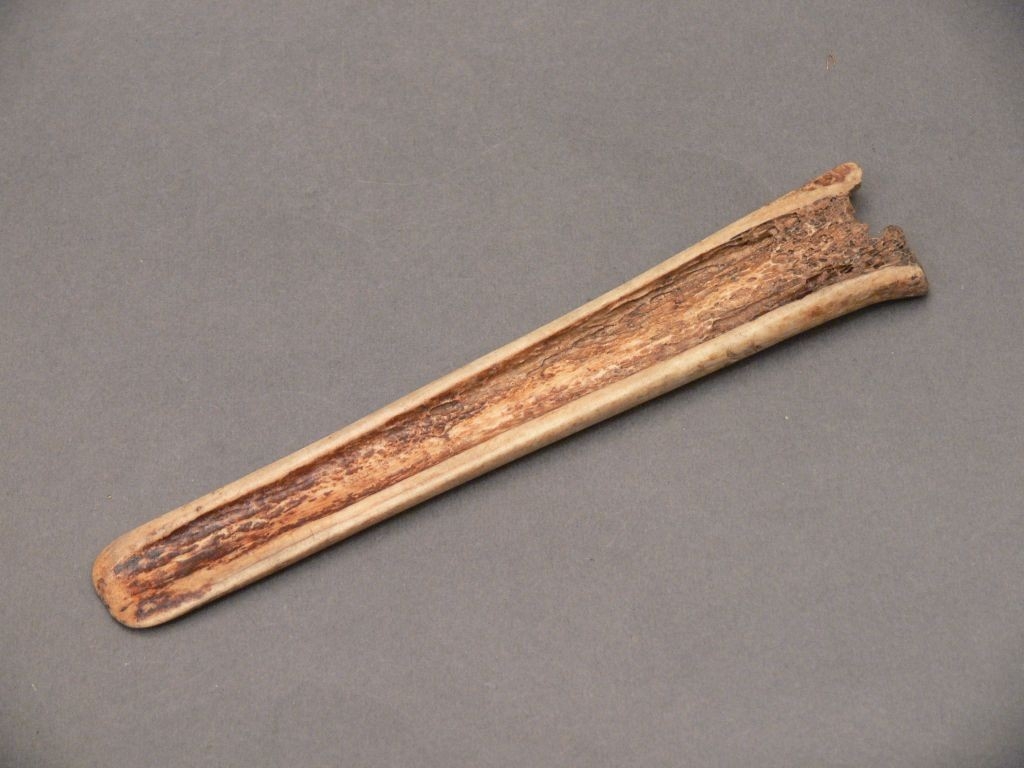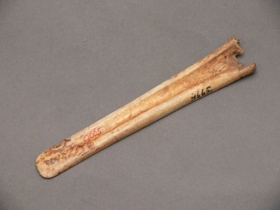 Sárgás színű, kés alakú, lapos csontdarab. Egyik vége lapos, hegyes, a másik törött.