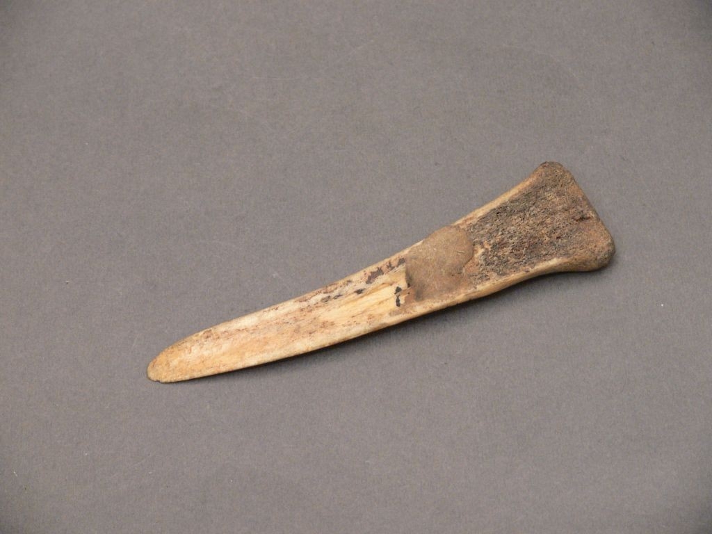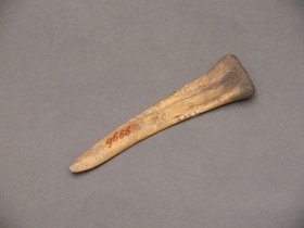 Sárgás színű, tőralakú, simára csiszolt, egyik oldalának felső részén recés csontdarab.