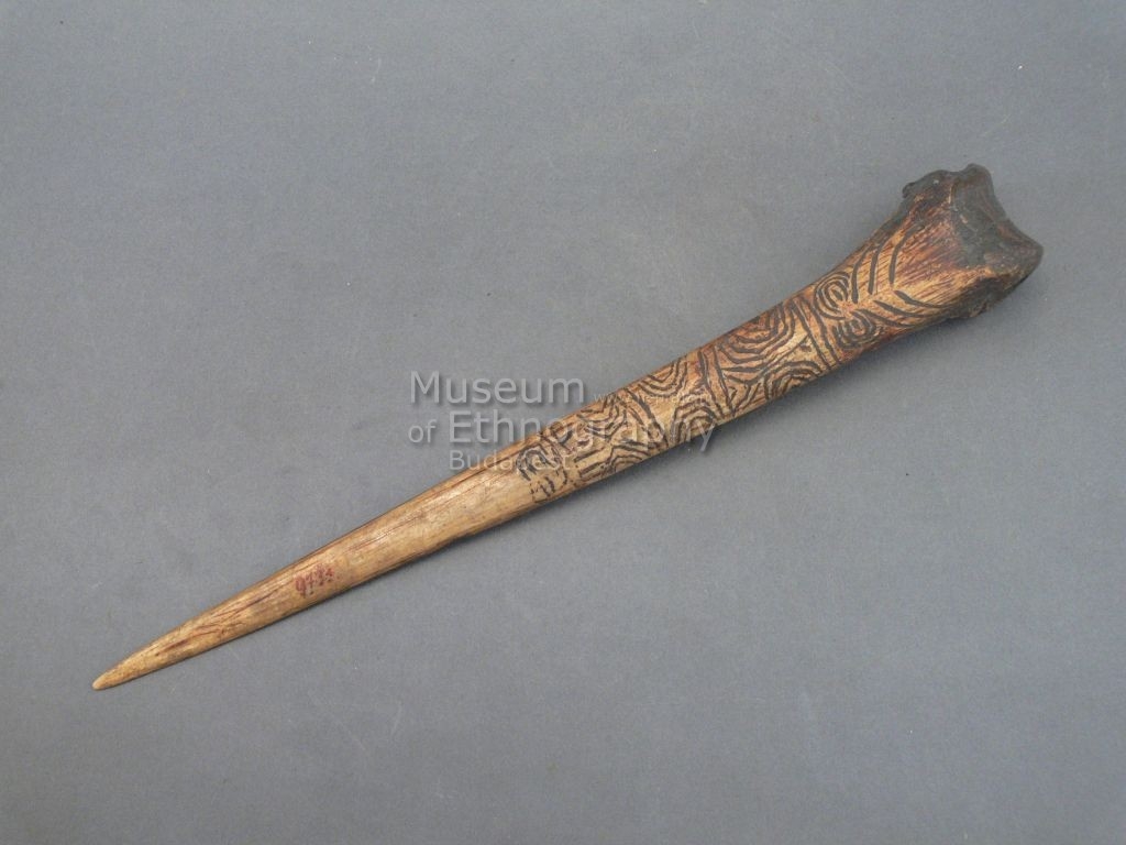 Kazuár csontjaiból készített eszköz. Alul hegyes, felül a markolatot a combcsont forgója alkotja. Színe barnás. Külső felületének felső felét vésett, vonalakból és ívekből álló hosszában szimmetrikus díszítés fedi.