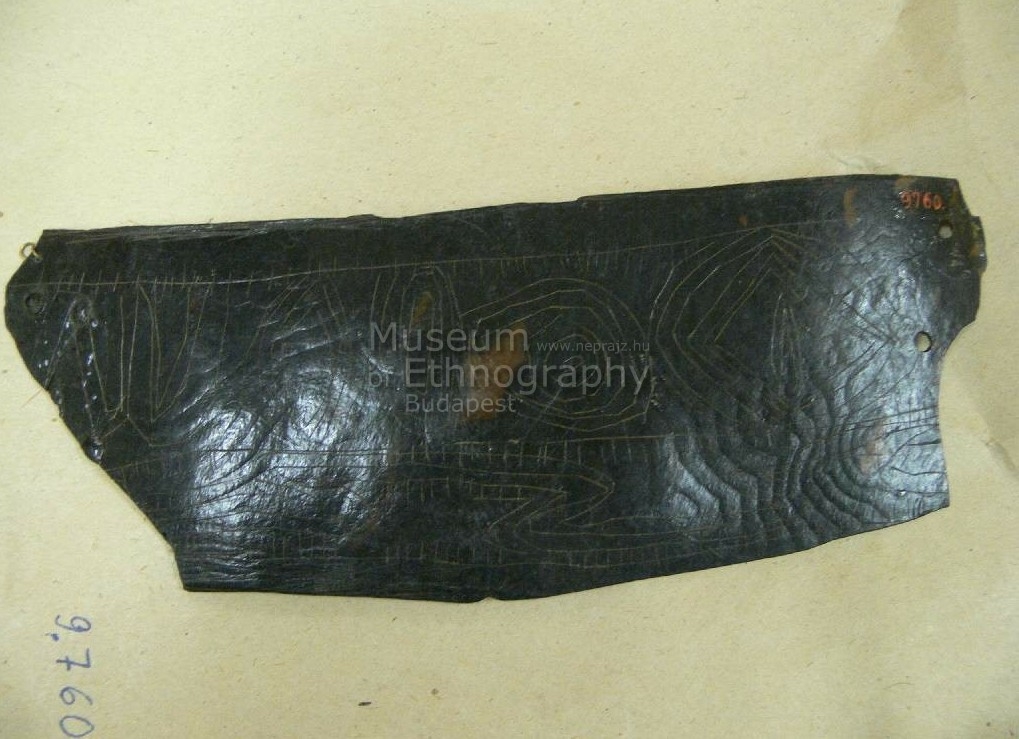 Hengeresre hajlított teknőshéj. Színe sötétbarna világossárga áttetsző foltokkal, végei egymásra hajlanak, széle repedezett. Külső felületén felületesen karcolt geometrikus mintázat borítja, inkusztálva. A vízszintes oldalaival párhuzamos vonalak osztják négy részre, ezeken belül fogasfogsorok két helyen pedig oválisok diszitik. A két szélső felén fogasfogsorok láthatók.