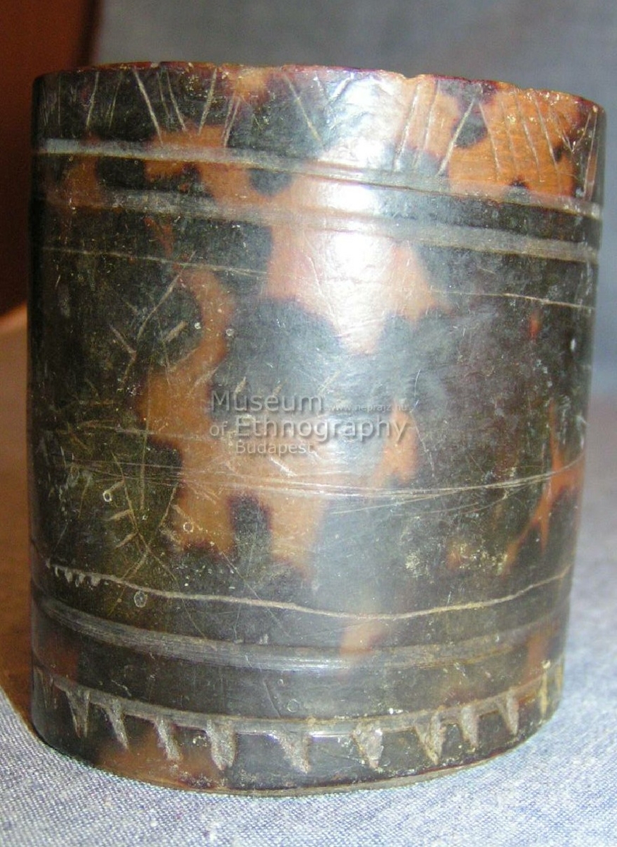 Hengeresre hajlított tenkőshéj. Szine sötétbarna, világossárga foltokkal. Áttetsző. Végei egymásra hajlanak. Külső felületén vésett motívumok díszítik: szélein két-két párhuzamos vonal, mindkettőn kívül farkaskog motívum. A közöttük lévő üres felületen vékonyan bekarcolt két minta: UTILATALA szerű.