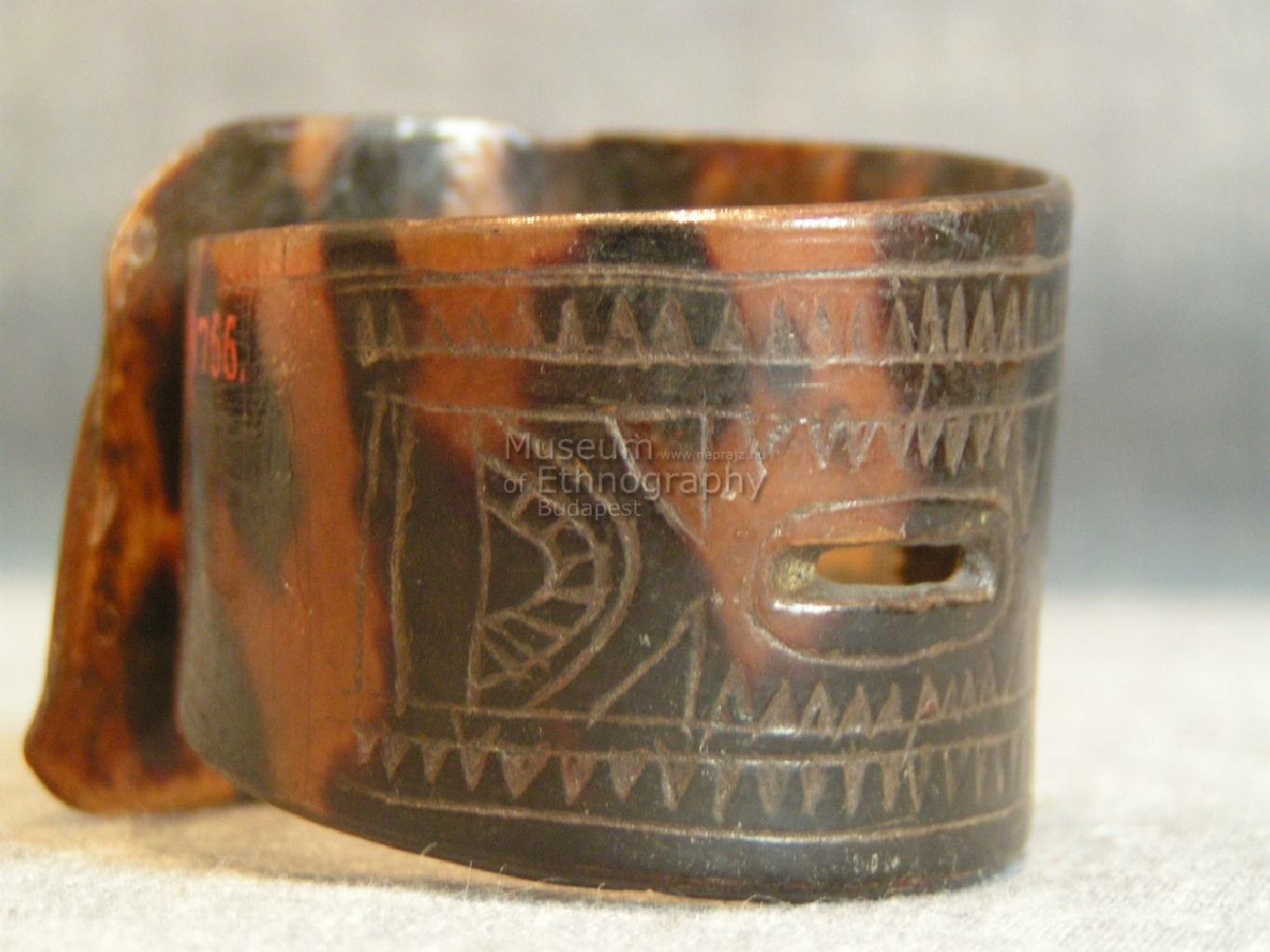 Hengeresre hajlított tenkőshéj. Szine sötétbarna, világossárga foltokkal. Áttetsző. Végei egymásra hajlanak. Külső felületén karcolt geometrikus minázatú áttört teknőchéjkarperec: szélein 3-3 párhuzamos vonal, a két-két külső között farkasfog. Az áttörés egy koncentrikus kör és egy-egy ovális lyuk, ezen formákat követik a motivumok. Farkasfog veszi őket közre. A keskenyebb oldallal párhuzamosan a két szélen és középen kalikali motivum. A karcolásokban eredetileg kagylópor volt.