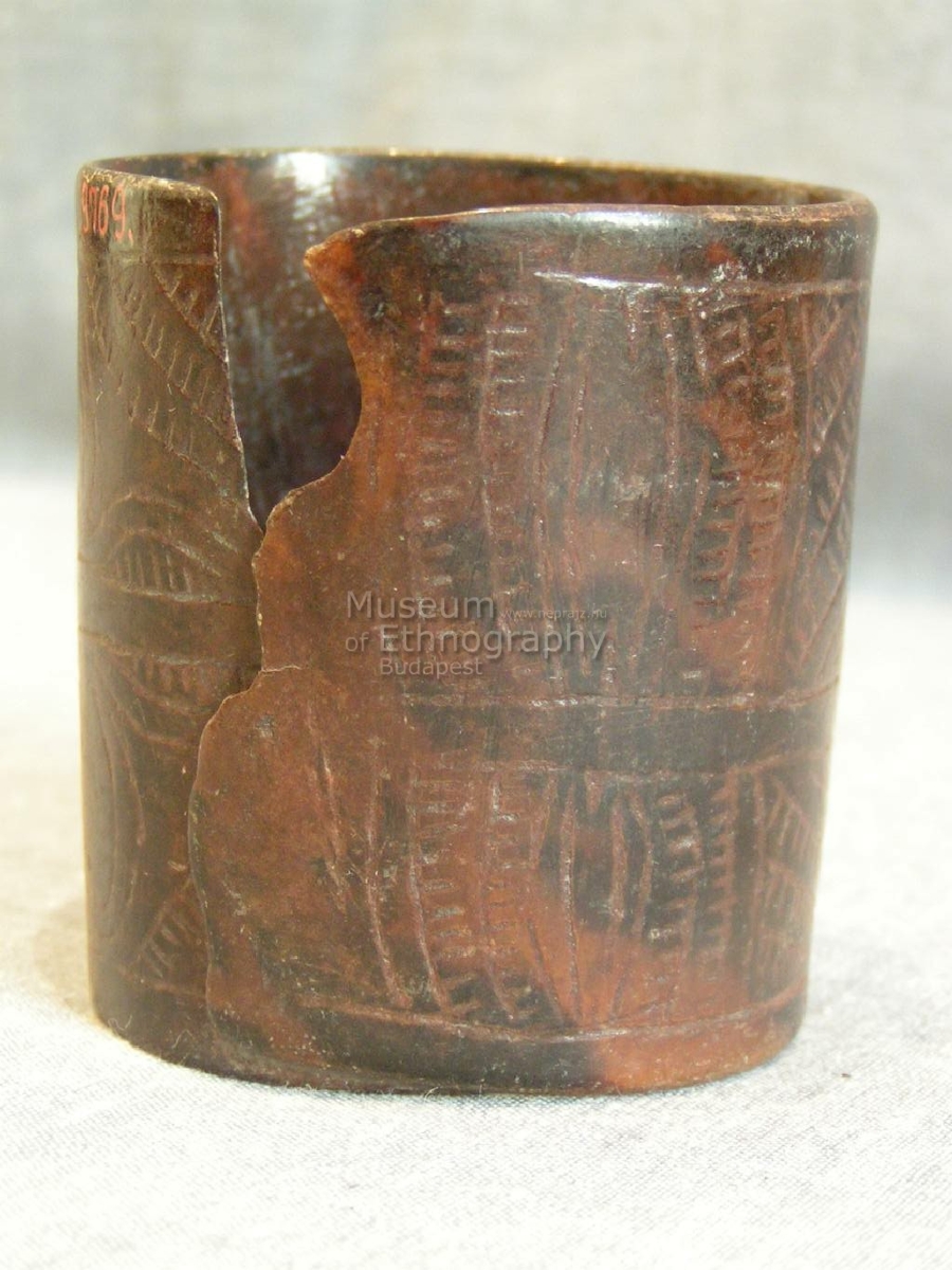 Hengeresre hajlított teknőshéj. Szine sötétbarna. Végei egymásra hajlanak, a külső töredezett. Külső felületén karcolt geometrikus minázatú. Keskenyebb szélével párhuzamosan szem motivum osztja két részre. A szélső részekben négy, egymással derékszöget alkotó szemotívum található, amely igy virágra hasonlító formát ad ki, a vizszintesek farkasfoggal vannak diszitve. A hosszanti oldallal párhuzamosan, középen két párhuzamos fut végig.