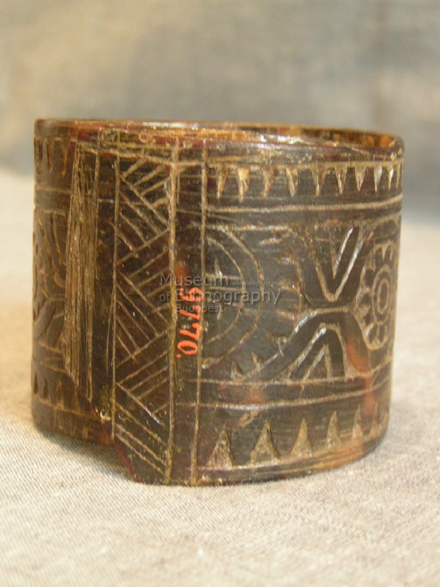 Hengeresre hajlított teknőshéj. Szine sötétbarna világossárga áttetsző foltokkal. Végei egymásra hajlanak, a külső töredezett. Külső felületén karcolt geometrikus minázatú. Keskenyebb szélével párhuzamosan a külső szélén páthuzamos vaonalak közt MAGOLATAL minta. A hosszanti oldallal párhuzamosan, a két szélen három-három párhuzamos fut végig, a legszélsőtől befelé farkasfoggal díszítve. Középen öt és fél látható KANKAN minta (a letakart részt nem látni). Köztük KAPUNGIN minta részletei. Fehér inkusztáció nyomaival.