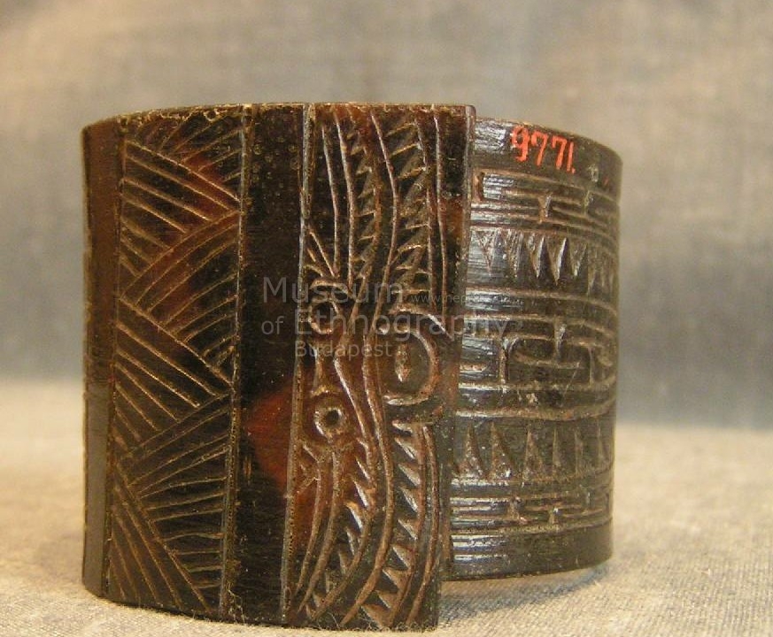 Hengeresre hajlított teknőshéj. Szine sötétbarna. Végei egymásra hajlanak. Külső felületén karcolt geometrikus minázatú. Keskenyebb szélével párhuzamosan a külső szélén farkasfog, YABO és KEMATEN minták. Beljebb két párhuzamos közt MAGOLATAL minta. A hosszanti oldallal párhuzamosan, a két szélen egy-egy párhuzamos fut végig, középen KANKAN minta látható, oldalra egy-egy MATAUOLU által körülvett fél oválison belül KEMATEN minták. Azon kívül is KEMATEN és YABO és SEMASEM minták. Fehér inkusztáció nyomaival.