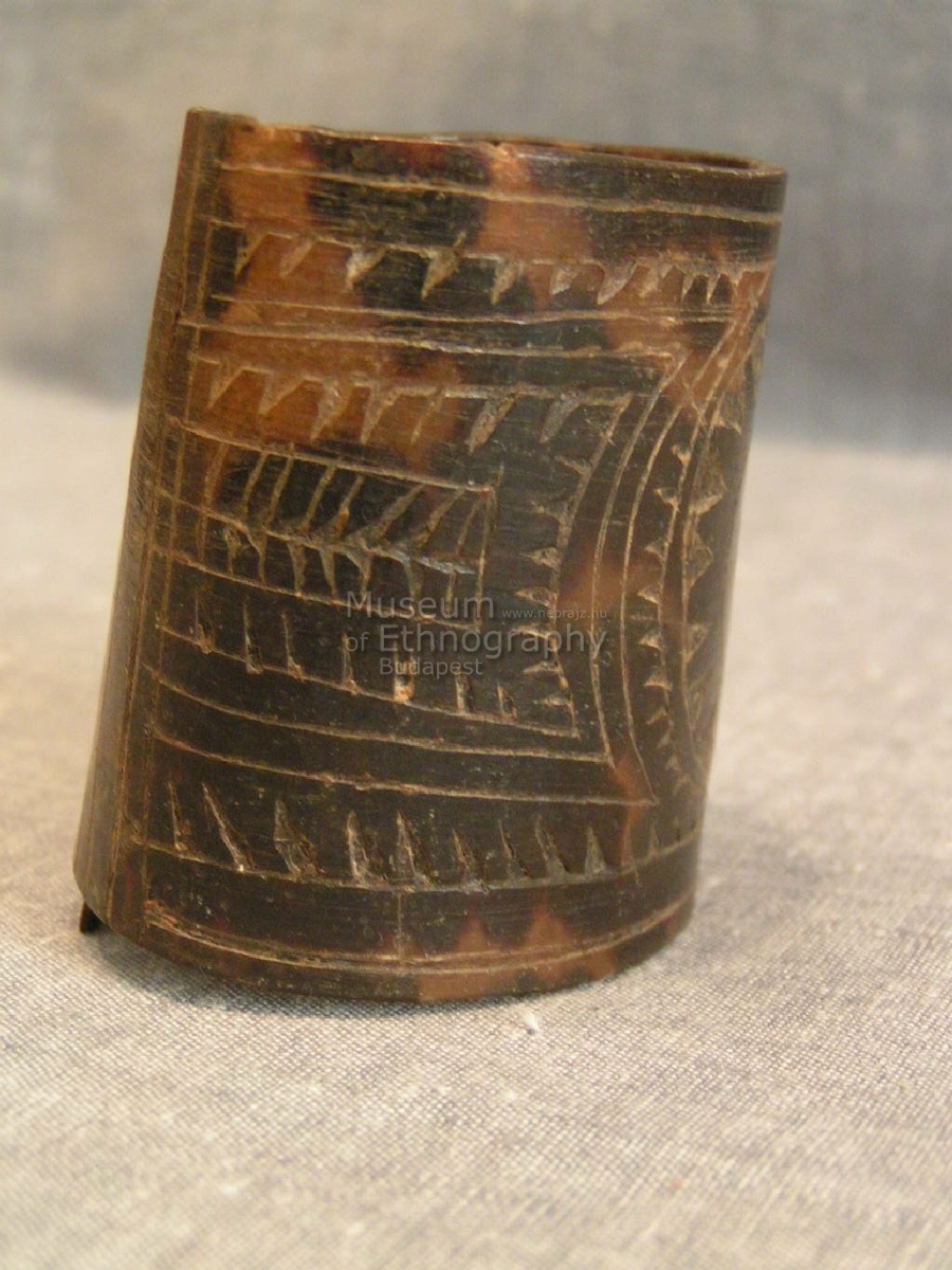 Hengeresre hajlított teknőshéj. Szine sötétbarna világossárga áttetsző foltokkal. Végei egymásra hajlanak, a külső töredezett. Külső felületén karcolt geometrikus minázatú. Keskenyebb szélével párhuzamosan, a külső szélén öt párhuzamos vonalak van. A karkötő közepén KANKAN minta van, attól balra egy téglalap három oldalát körbezáró farkasfogminták, azon belül párhuzamosok mégbeljebb farkasfogminta, azon belül SEMASEM (?). A jobb oldalon ugyan ilyen kitöltő 'sorozat' de ovális alakban.