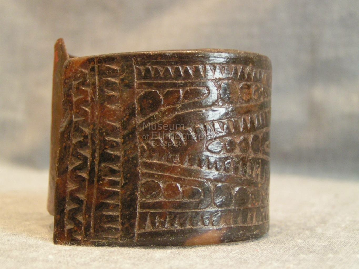 Hengeresre hajlított teknőshéj. Szine sötétbarna világossárga áttetsző foltokkal. Végei egymásra hajlanak. Külső felületén karcolt geometrikus minázatú. Keskenyebb szélével párhuzamosan a külső szélén páthuzamos vonalak közt KALIKALI mellette beljebb farkasfog minta. Ettől beljebb a hosszanti oldallal párhuzamosan, a két szélen egy-egy párhuzamos fut végig. A karperec közepén egy KALIKALI szalag, ennek két oldalán szimmetrikus mintázat, ami a következő. Egy fektetett háromszög, rövid oldala a közép felé néz, hegye a karperec széle felé. A háromszög belső oldalán farkasfogak, beljebb KEMATEN sor. A háromszögön kívül fenn és lenn szintén szimmetrikus mintázat, a széle felé farkasfogsor, beljebb két KALIKALI szalag közt KEMATEN.