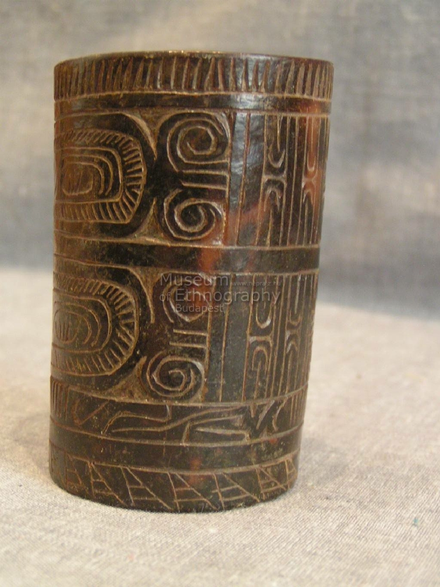 Hengeresre hajlított teknőshéj. Szine sötétbarna világossárga áttetsző foltokkal. Végei egymásra hajlanak. Külső felületén karcolt geometrikus minázatú. A hosszanti oldallal párhuzamosan, a szélein kettő ill. három párhuzamos fut végig, a felsőt farkasfoggal tölti ki, az alsó részben a legszélsőt kis dölt háromszögek, minden második vizszintes vonalakkal kitöltve. A következ üres, a harmadik 'szalagban' farkasfogminták és szokatlan geomterikus minták váltják egymást. A belső felületet középen két párhuzamos osztja ketté, aminek két oldalán szimmetrikusak a minták. Ezeknek függőlegesen nézve e közepén párhuzamosok és lekerekített végű párhuzamosok váltják egymást kb. 22 cm szélességben. Jobb és bal oldalán pedig közép felé, két egymásnak háttal álló KEMATEN, ettől kijebb lekerekitett téglalapban, annak az oldalaival párhuzamosok és azt kitöltő farkasfogminták váltják egymást. Ezen belül fél szemmotívum (?)