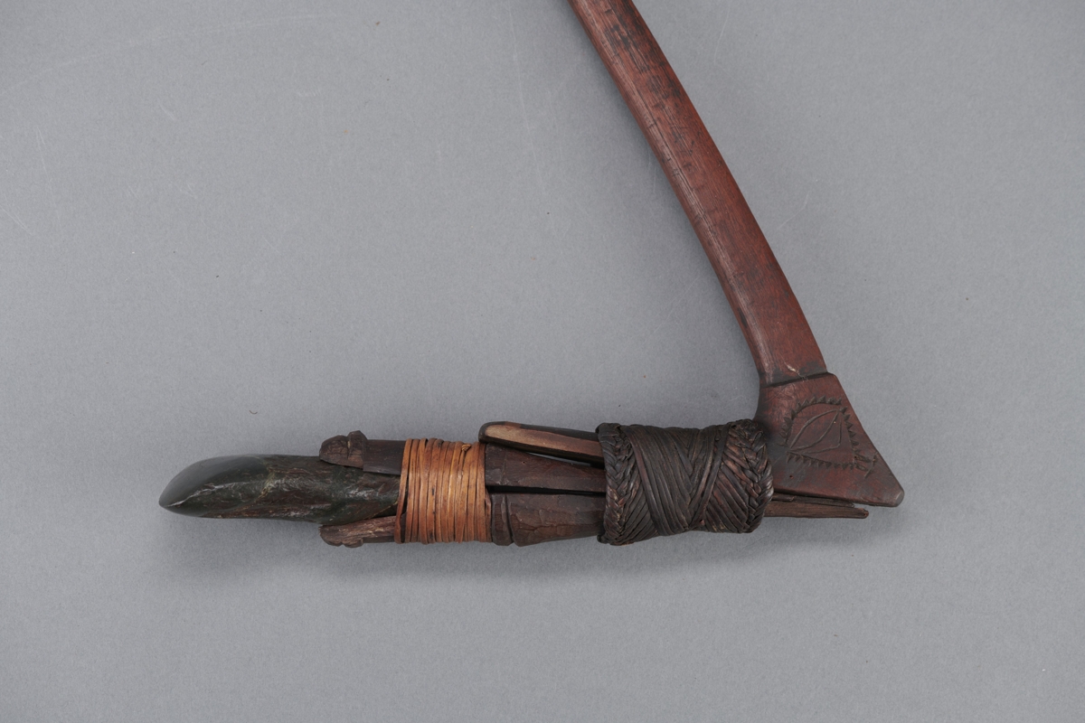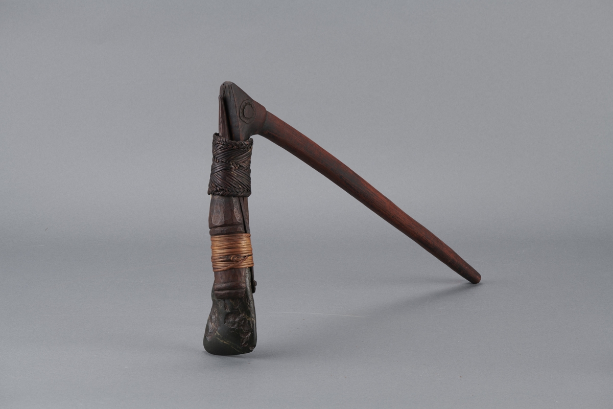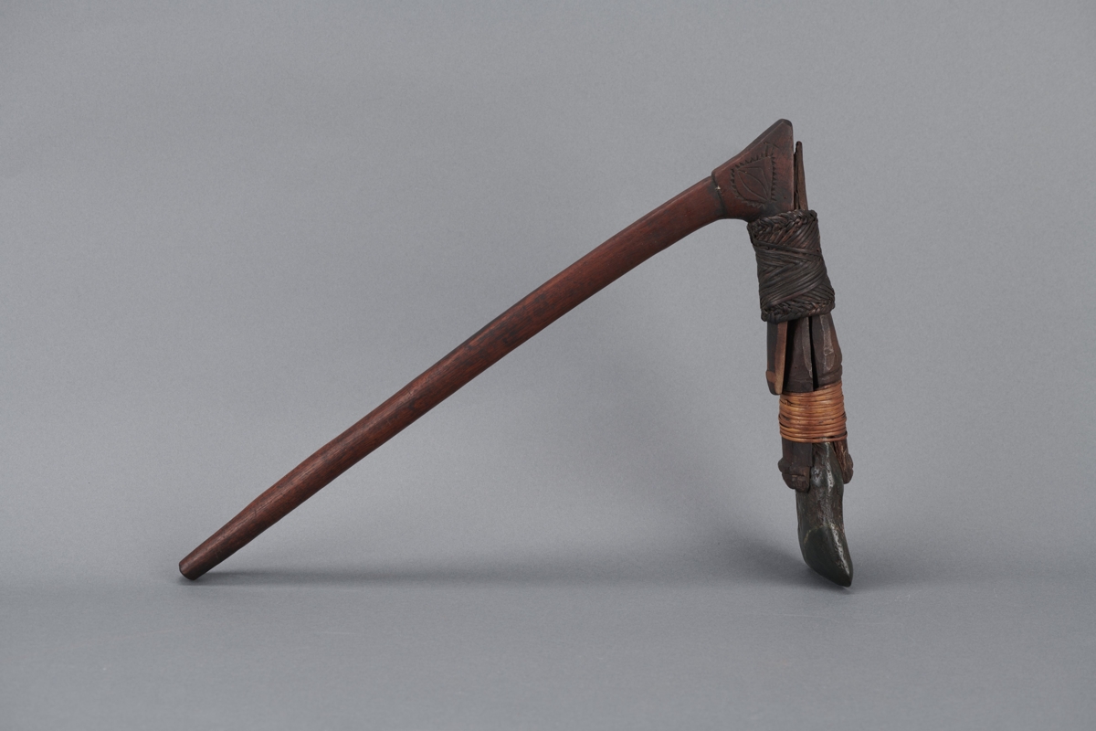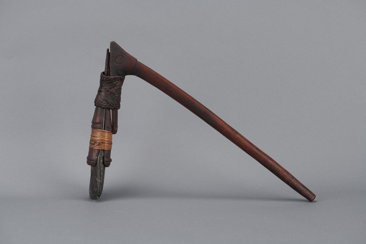 Fanyelű balta kőpengével. Nyele sötétbarna színű, hosszú, enyhén íves, hengeres keményfából faragott. A nyelet képező fa ága kb 80 fokot zár be, erre van rögzítve a penge foglalata, amihez az ág el van laposítva. A külön foglalat két faragott fa elemből áll, végén ellaposodó hengert képezve. Szélesebb végébe illeszkedik a sötét kőpenge. A foglalatot világos spanyolnádszalag rögzíti. A foglalat a nyél hajló részéhez finom kidolgozású spanyolnád csíkkal van rögzítve. A kőpenge lapos, hegyesre csiszolt, a nyéllel megegyező irányban rögzítve.