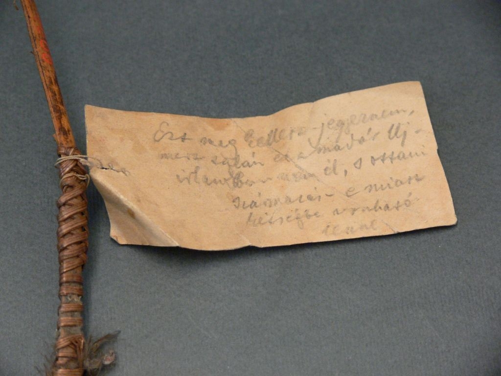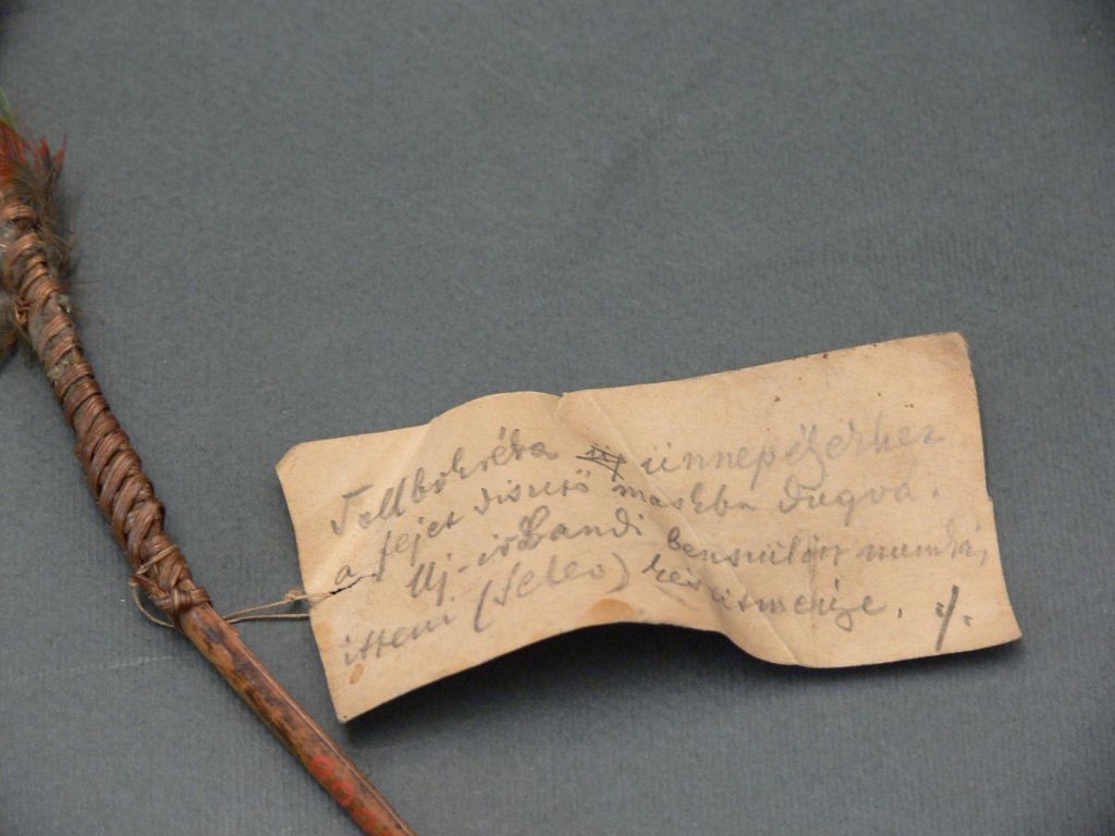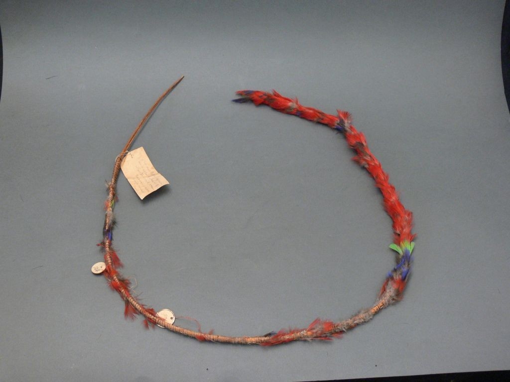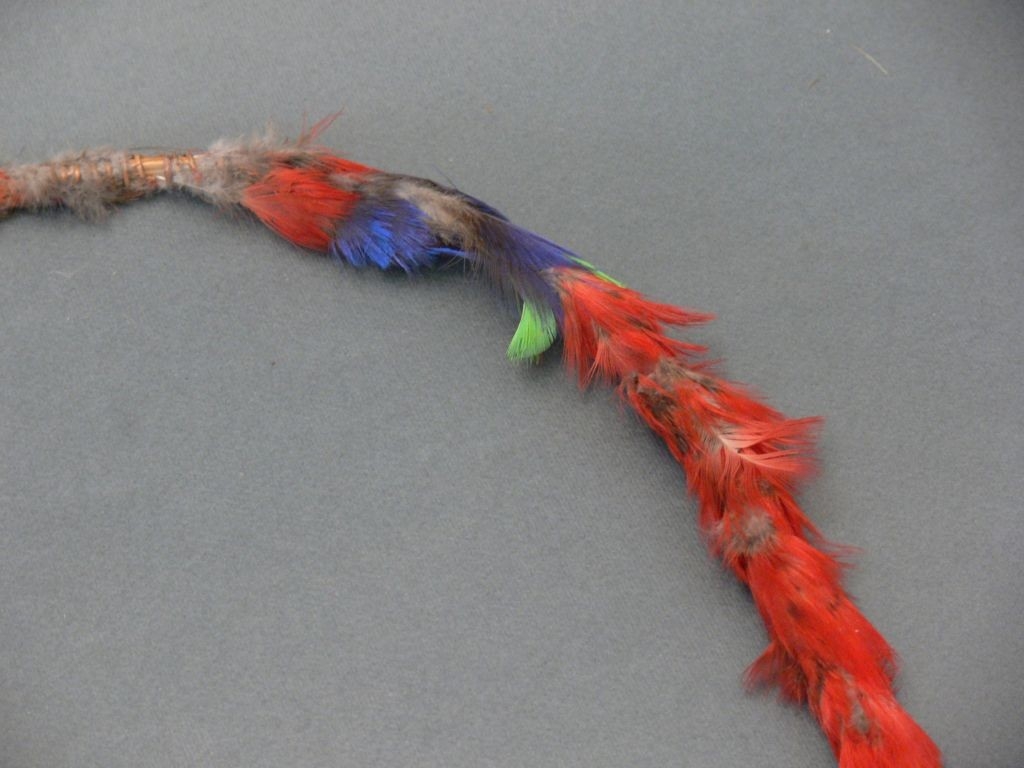 Íves, majdnem kőrt alkotó bambuszcsíkra erősített piros kés és zöldes papagálytollak. Megritkultak.