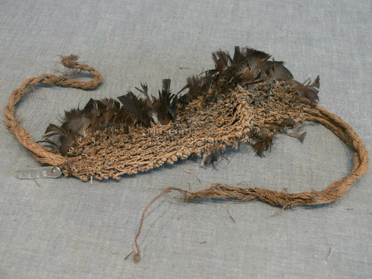 Barna rostfonat, szélein 3-3 háromágú fonásból készített 23 cm-es kötővel. A fonásba fekete tollak voltak rögzítve amelyek már csak alul láthatók keskeny csíkban.