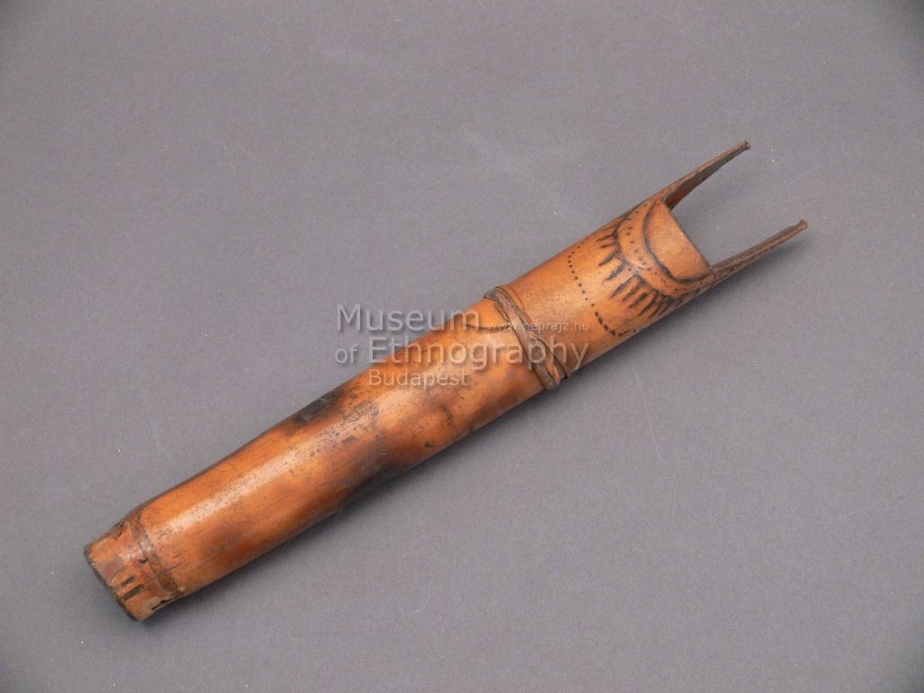 Sárgás-barnás színű, hengeres bambuszcső. Alsó részét a bambusz nódusa képezi, felső vége nyitott. Ugyanitt két nyúlvány. A perem alatti részen égetett vonalkázásból álló elnagyolt, sötétbarna díszítés. Első harmadába nádfonat.