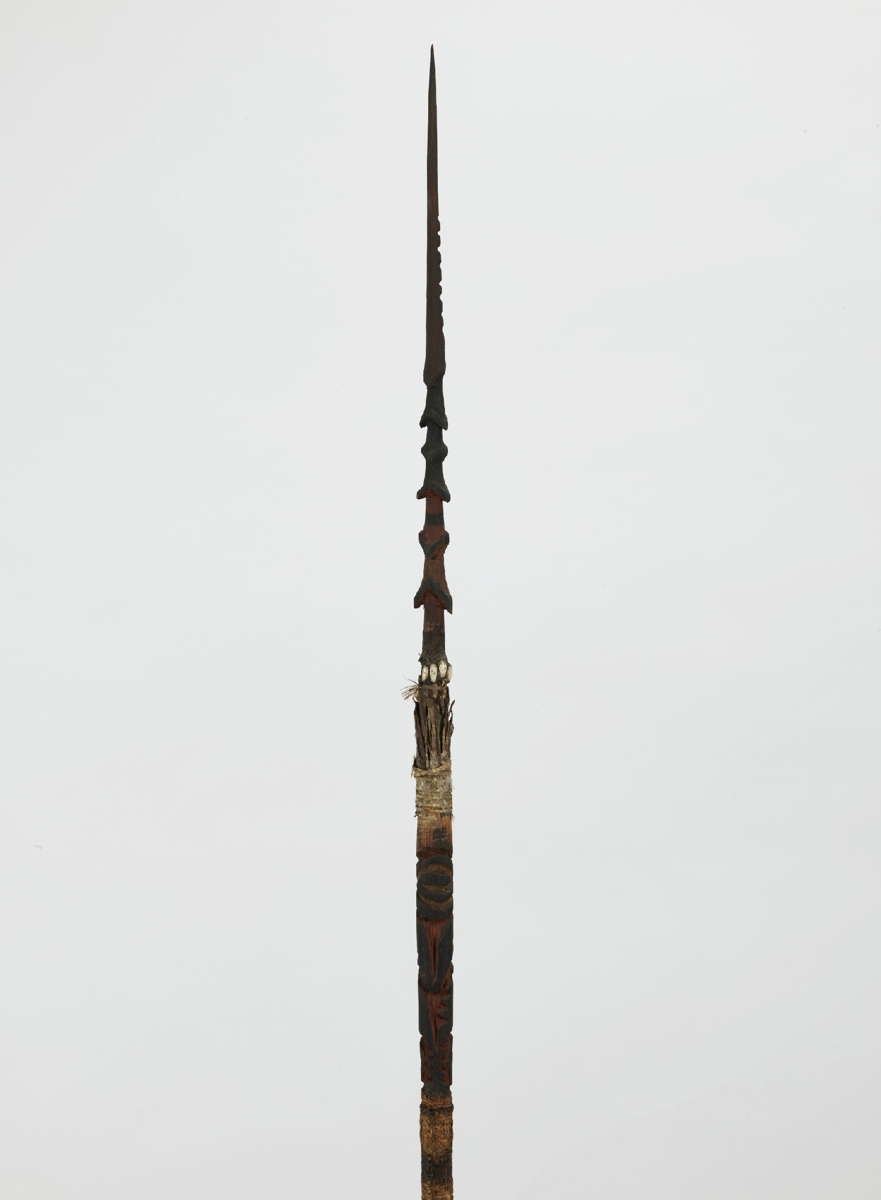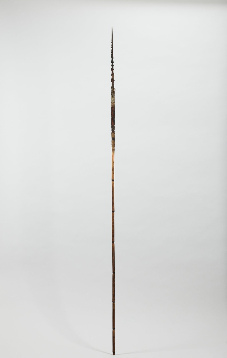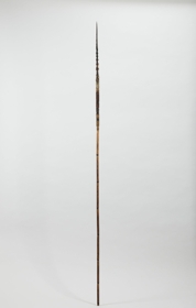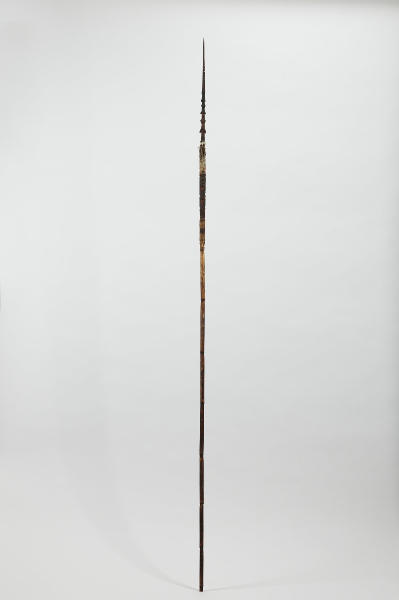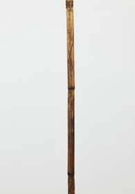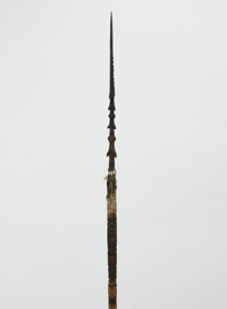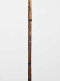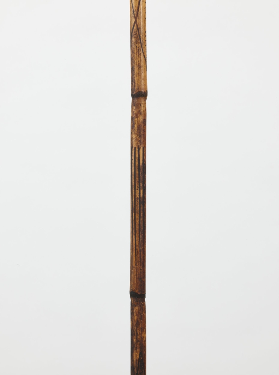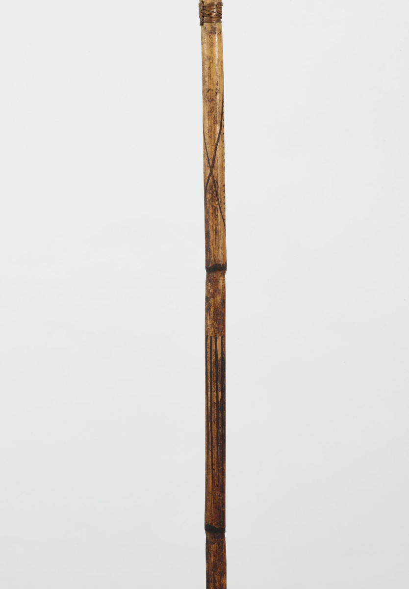 Kétrészes, nyele hengeres nád, karcolt mintákkal díszítve, keményfa hegye felül faragott ornamentikával díszített, közepe táján színes tollmaradványok és csontdarabok. A két részt fonott háncsgyűrűvel erősítették össze.