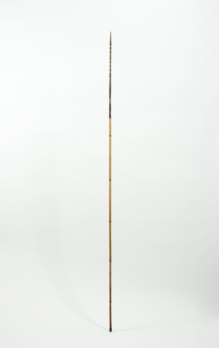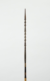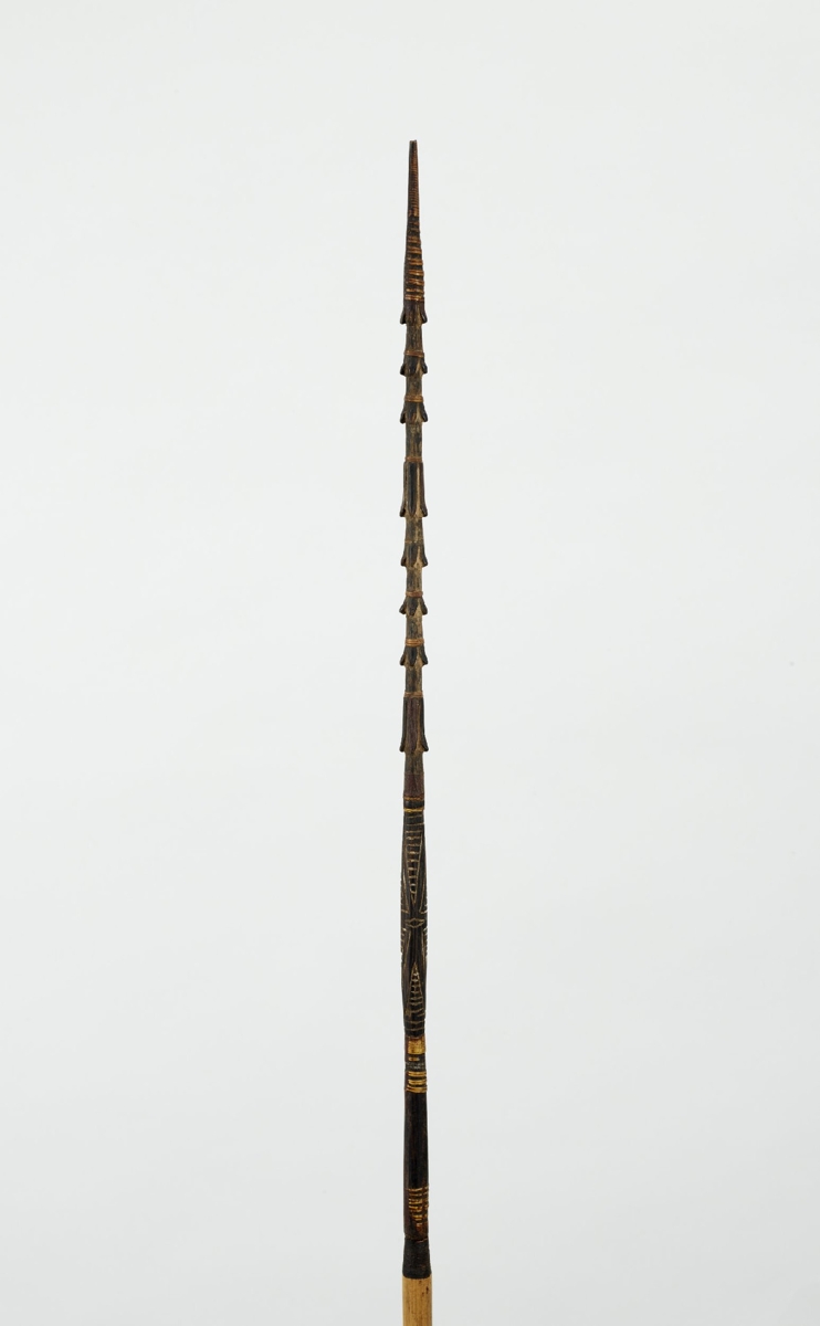 Kétrészes. Nyele sárgás színű, hengeres nád, hegye felül faragott keményfa. Alul karcolt mértanian mintákkal díszítve. A mélyedéseket fehér festékkel töltötték. A nyélbe dugott hegyet rosttal rögzítették.