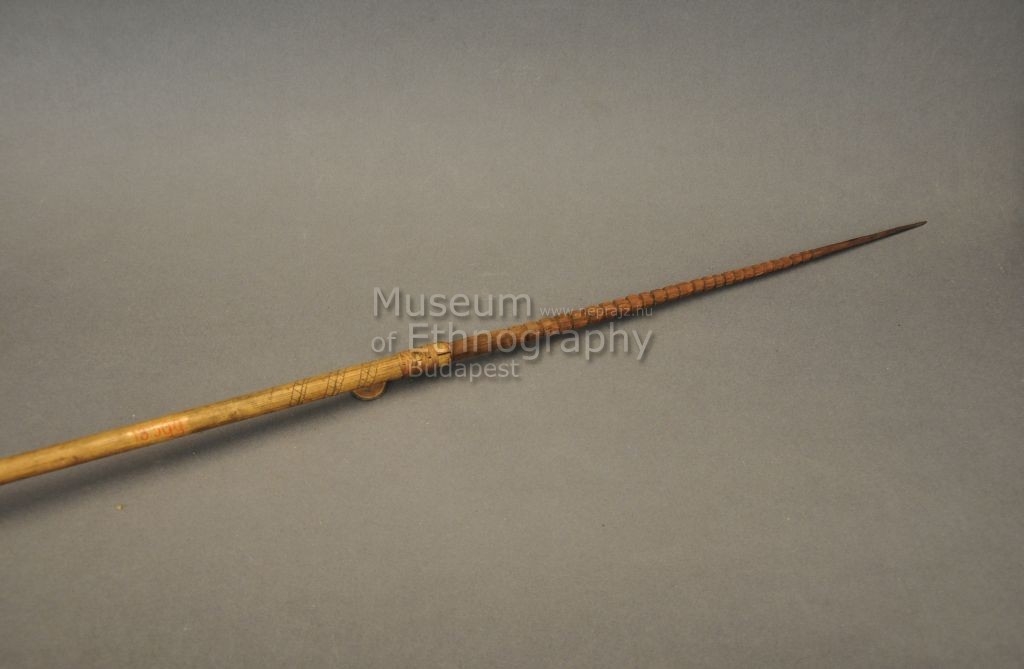 Kétrészes nyílvessző. A bambuszból készült szárba növényi rosttal kerek keresztmetszetű keményfa hegyet rögzítették, melybe sűrű, körbefutó rovátkákat véstek.