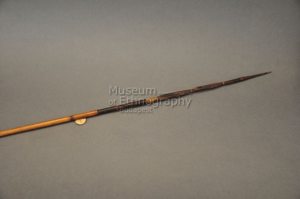 Kétrészes nyílvessző. A bambuszból készült szárba keményfa hegyet illesztettek, amelyhez növényi rosttal fából hasított szakákat rögzítettek. A szár négy szakaszát beégetett párhuzamos vonalakból álló minták díszítik.