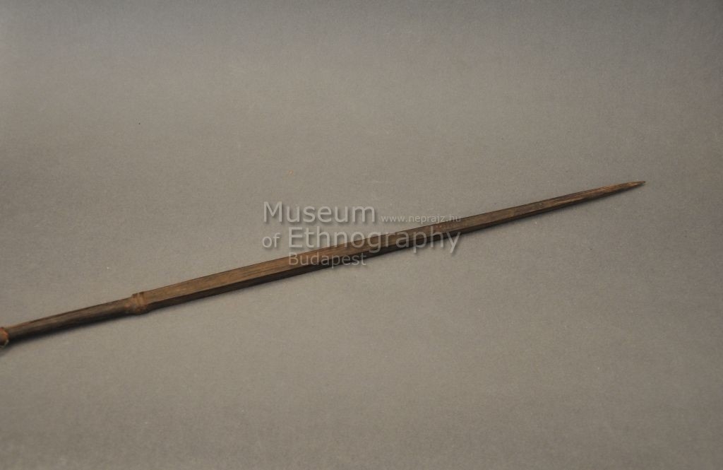 Kétrészes nyílvessző. A bambuszból készült szárba növényi rostfonattal rögzítették a négyzetes keresztmetszetű keményfa hegyet.