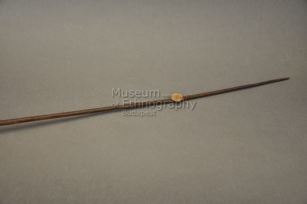 Kétrészes nyílvessző. A bambuszból készült szárba növényi rosttal rögzítették a keményfa hegyet. A szár közepét égetéssel készült minta díszíti.
