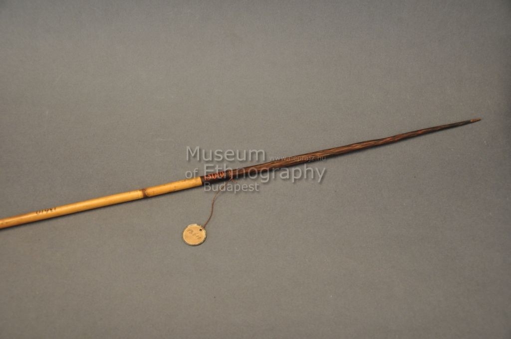 Kétrészes nyílvessző. A bambuszból készült szárba keményfa hegyet illesztettek. A szár hét szakaszát beégetett párhuzamos vonalakból álló minták díszítik.