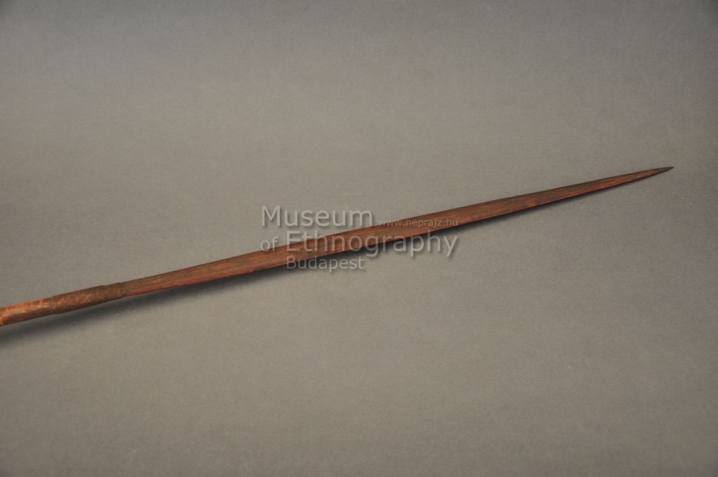 Kétrészes nyílvessző. A bambuszból készült szárba növényi rostfonattal rombusz keresztmetszetű keményfa hegyet rögzítették. A szárat geometrikus motívumokkal díszítették.