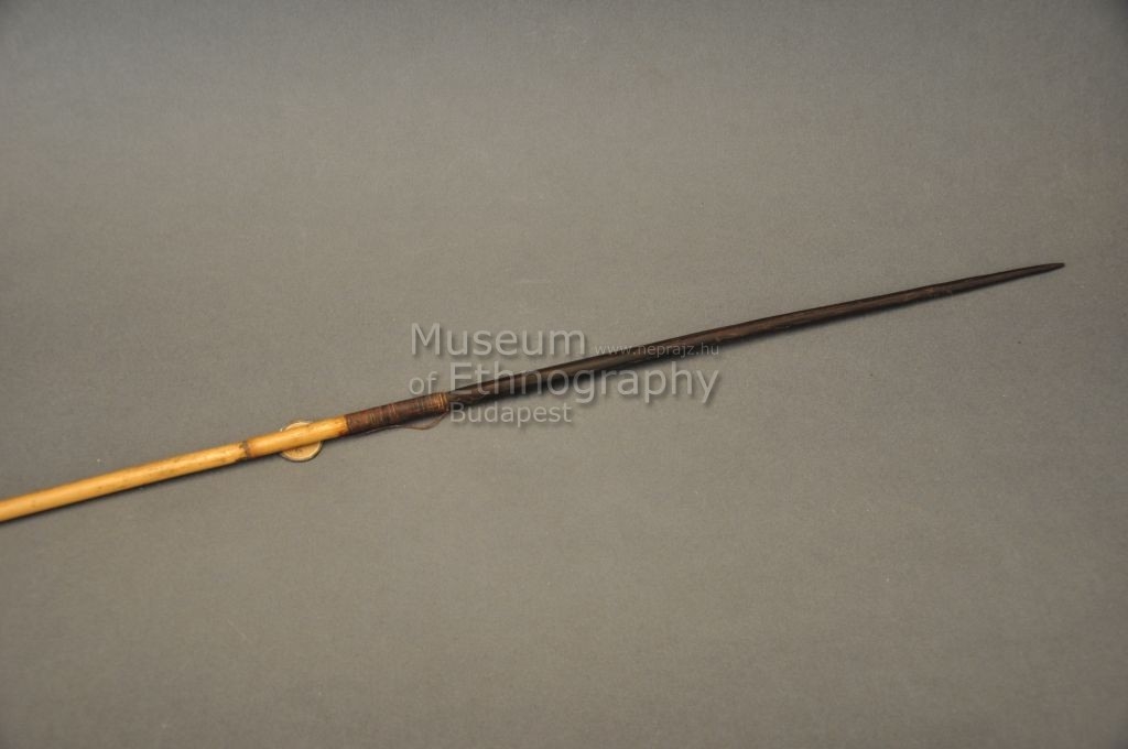 Kétrészes nyílvessző. A bambuszból készült szárba növényi rosttal rögzítették a keményfa hegyet. A szár négy szakaszát beégetett párhuzamos vonalakból álló minták díszítik.