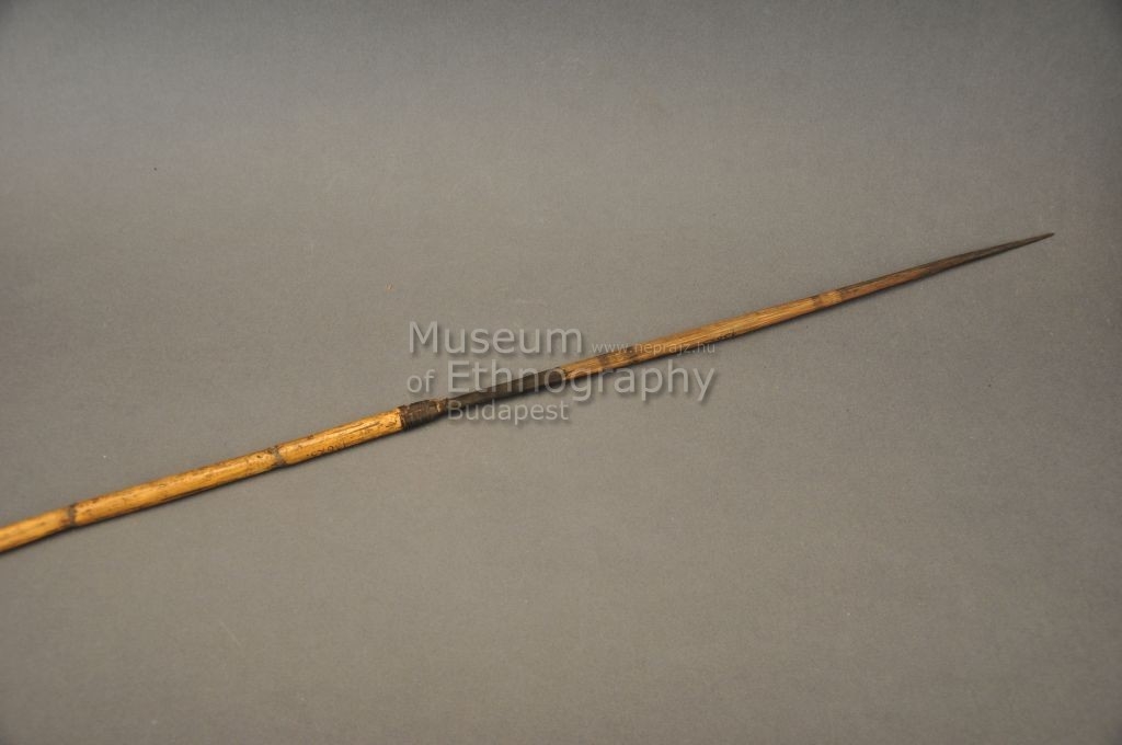 Kétrészes nyílvessző. A bambuszból készült szárba növényi rosttal rögzítették a keményfa hegyet, melynek alsó részét feketére festették, fölötte két további fekete csík található.