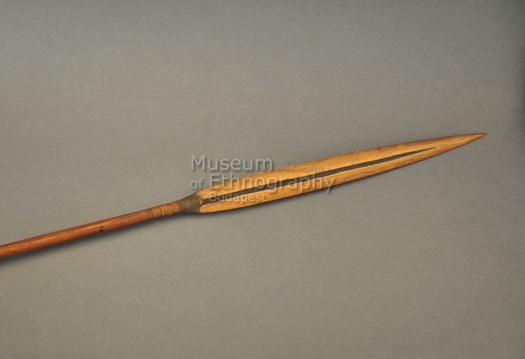 Kétrészes nyílvessző. A bambuszból készült szárba növényi rosttal ovális keresztmetszetű keményfa hegyet rögzítettek, melyre fekete festékkel geometrikus díszítést festettek.