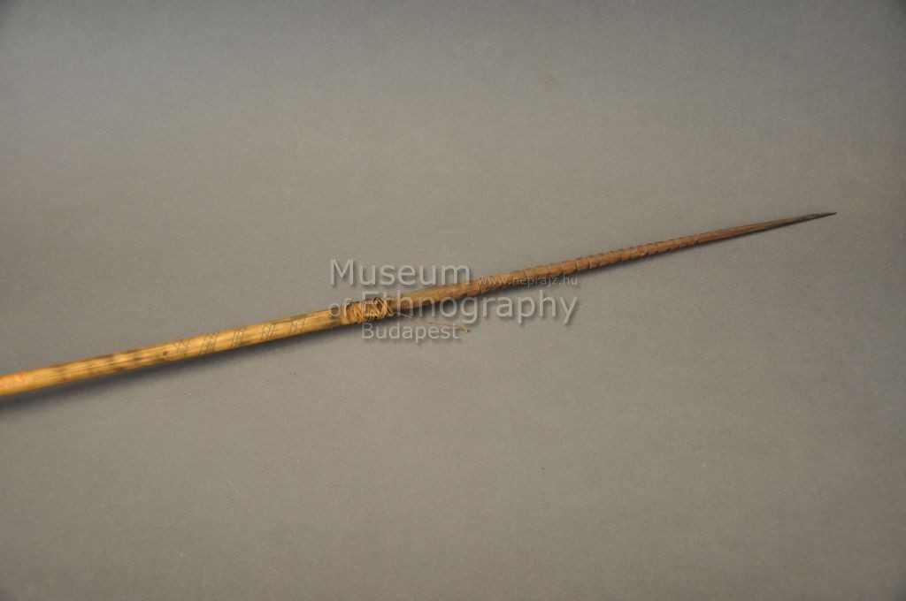 Kétrészes nyílvessző. A bambuszból készült szárba növényi rosttal rögzítették a kerek keresztmetszetű keményfa hegyet., melynek középső szakaszába sűrűn, körbefutó rovátkákat véstek.