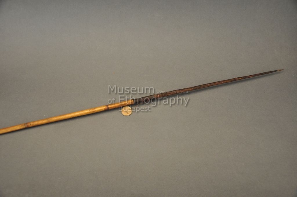 Kétrészes nyílvessző. A bambuszból készült szárba keményfa hegyet illesztettek. A szár öt szakaszát beégetett párhuzamos vonalakból álló minták díszítik.