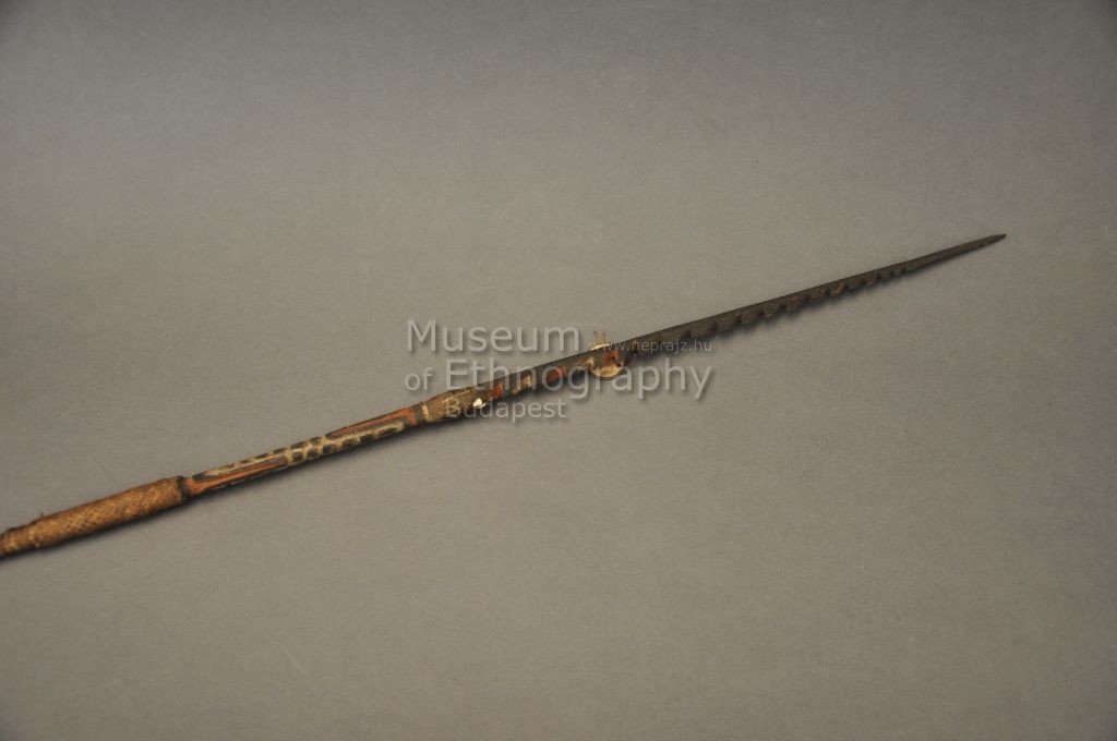 Kétrészes nyílvessző. A bambuszból metszett szárba növényi rostfonattal rögzítették a fából faragott hegyet, melynek alsó részébe fehér és vörös festékkel kitöltött geometrikus motívumokat mélyítettek, a többibe szakákat faragtak. A két rész találkozását ragasztóba illesztetett apró csigákkal ékesítették. A szárat hosszanti irányban futó beégetett vonalakkal díszítették.