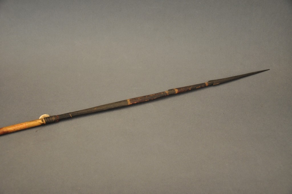 Kétrészes nyílvessző. A bambuszból készült szárba növényi rosttal rögzített keményfa hegyet illesztettek, melyet feketére festettek, és szakákat faragtak bele.
