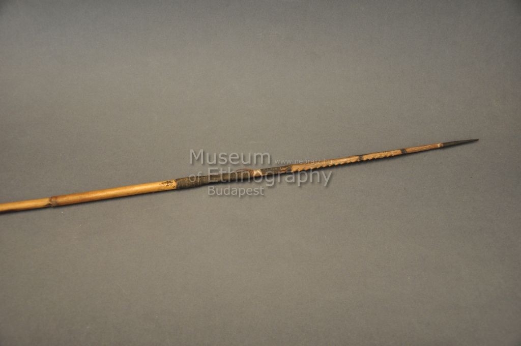 Kétrészes nyílvessző. A bambuszból készült szárba növényi rosttal rögzített, trapéz keresztmetszetű keményfa hegyet illesztettek, melybe szakákat faragtak, illetve részben feketére festettek.