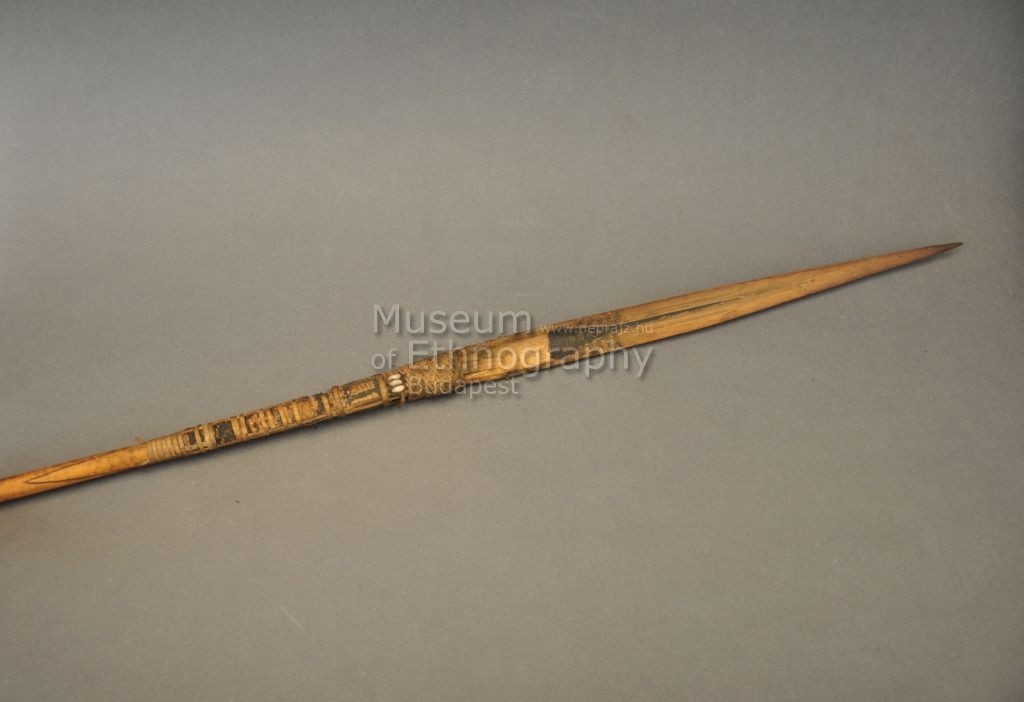 Kétrészes nyílvessző. A bambuszból metszett szárba növényi rosttal rögzítették az ugyancsak bambuszból hasított, levélalakú hegyet, melynek belső oldalát fekete geometrikus festés ékesíti. A rögzítő rostfonatot apró csigákkal díszítették, a szárat pedig hosszanti beégetett vonalakkal.