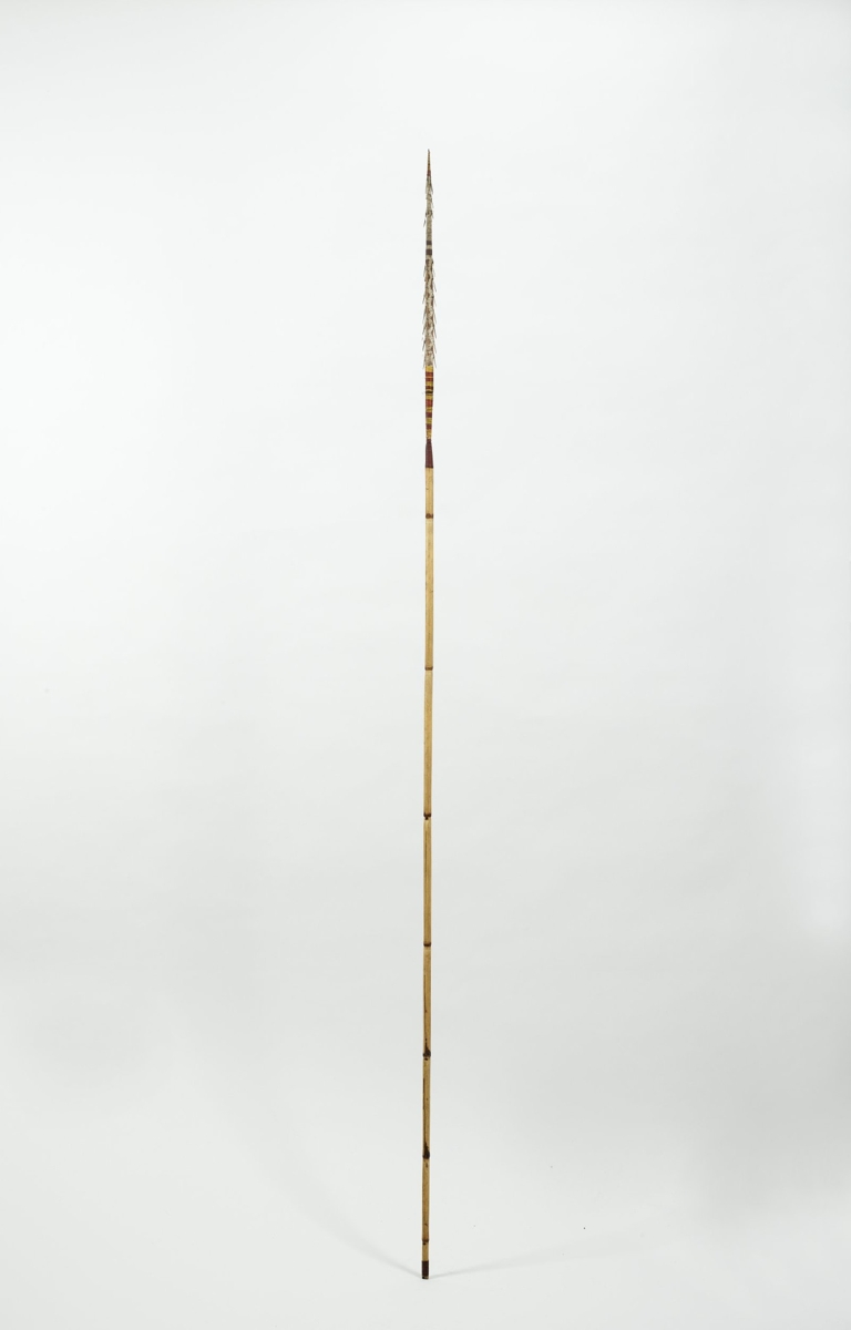 Kétrészes nyílvessző. A bambuszból készült szárba növényi rosttal rögzítették a fából készült hegyet, melyhez ugyancsak növényi rostzsinórral tüskéből készült szakákat erősítettek. Rost tekercseléssel erősítették meg a nyílvessző végén található rovátkát is, ami a nyílvesszőnek az íj húrjába történő beillesztését segítette.