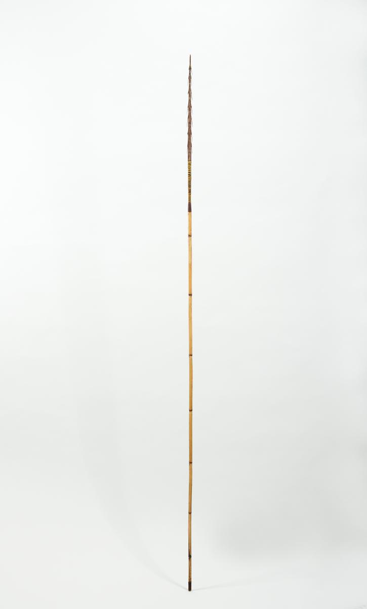 Kétrészes nyílvessző. A bambuszból készült szárba növényi rosttal rögzítették a fából készült hegyet, melyhez ugyancsak növényi rostzsinórral tüskéből készült szakákat erősítettek. Rosttekercseléssel erősítették meg a nyílvessző végén található rovátkát is, ami a nyílvesszőnek az íj húrjába történő beillesztését segítette.